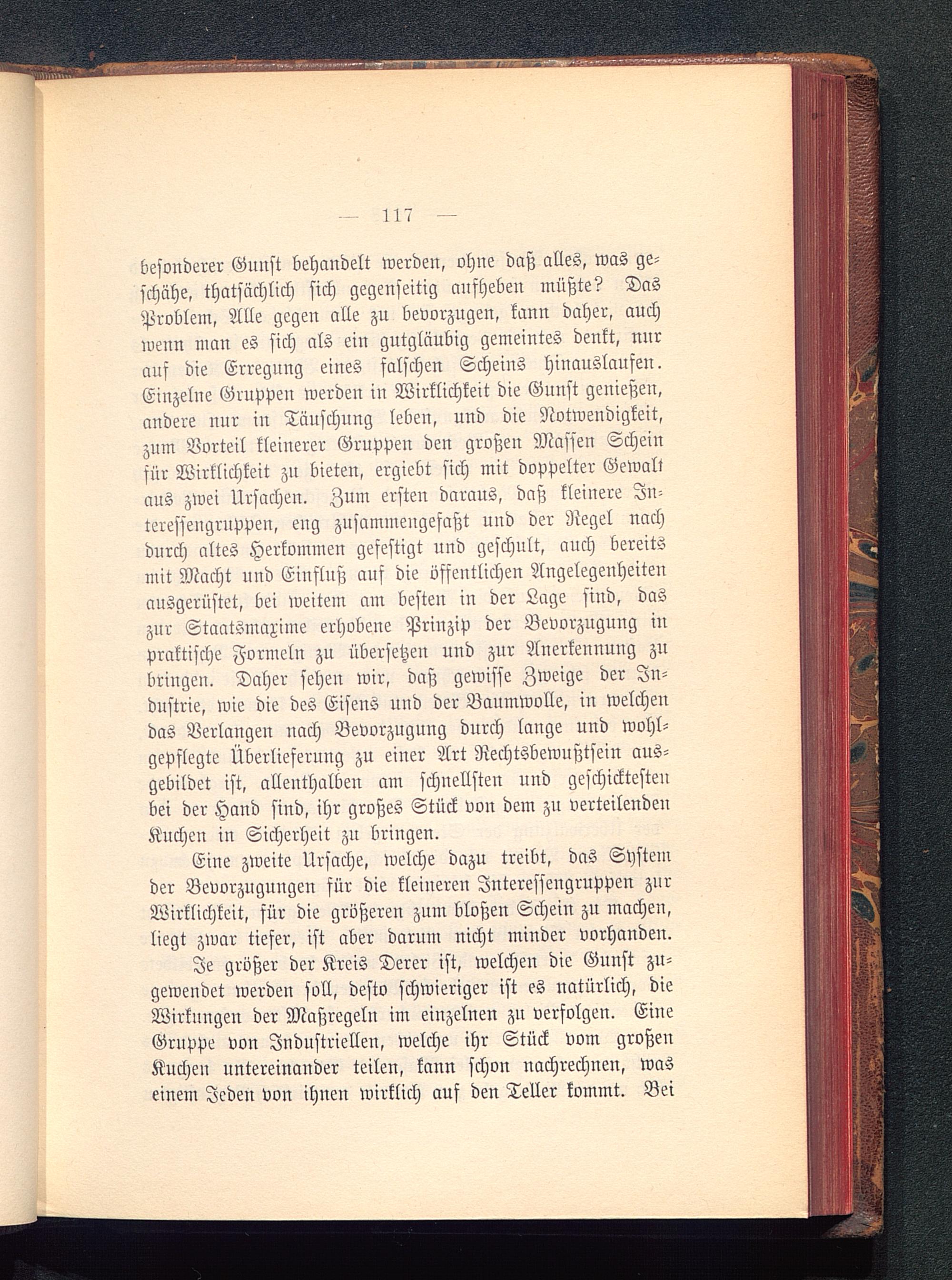 besonderer Gunst behandelt werden, ohne daß alles, was ge-schähe, thatsächlich sich gegenseitig aufheben müßte? DasProblem, Alle gegen alle zu bevorzugen, kann daher, auchwenn man es sich als ein gutgläubig gemeintes denkt, nurauf die Erregung eines falschen Scheins hinauslaufen.Einzelne Gruppen werden in Wirklichkeit die Gnnst genießen,andere nur in Täuschung leben, und die Notwendigkeit,zum Vorteil kleinerer Gruppen den großen Massen Scheinfür Wirklichkeit zu bieteu, ergiebt sich mit doppelter Gewaltaus zwei Ursachen. Zum ersten daraus, daß kleinere In-teressengruppen, eng zusammengefaßt und der Regel nachdurch altes Herkommen gefestigt und geschult, auch bereitsmit Macht und Einfluß auf die öffentlichen Angelegenheitenausgerüstet, bei weitem am besten in der Lage sind, daszur Staatsmaxime erhobene Prinzip der Bevorzugung inpraktische Formeln zu übersetzen und zur Anerkennung zubringen. Daher sehen wir, daß gewisse Zweige der In-dustrie, wie die des Eisens und der Baumwolle, in welchendas Verlangen nach Bevorzugung durch lange und wohl-gepflegte Überlieferung zu einer Art Rechtsbewnßtsein aus-gebildet ist, allenthalben am schnellsten und geschicktestenbei der Hand sind, ihr großes Stück von dem zu verteilendenKuchen in Sicherheit zu bringen.