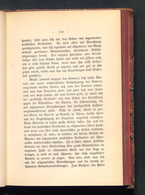handelt, stellt man sich auf den Boden des sogenanntenpraktischen Verstandes. Da wird alles mit Verachtungzurückgewiesen, was sich irgendwie auf allgemeine, das Ganzemittelst geordneter Gedankenreihen übersehende Schluß-folgerungen beruft. Der einzelne Fabrikant oder Grund-besitzer holt seine Bücher herbei und weist mit Ziffern nach,wie er nicht bestehen könne, wenn man ihm nicht Sicher-heit gebe, gewisse Preise zu erzielen, und wie gut es ihmgehen würde, wollte man ihm von StaatSwegen diese Sicher-heit gewähren.
