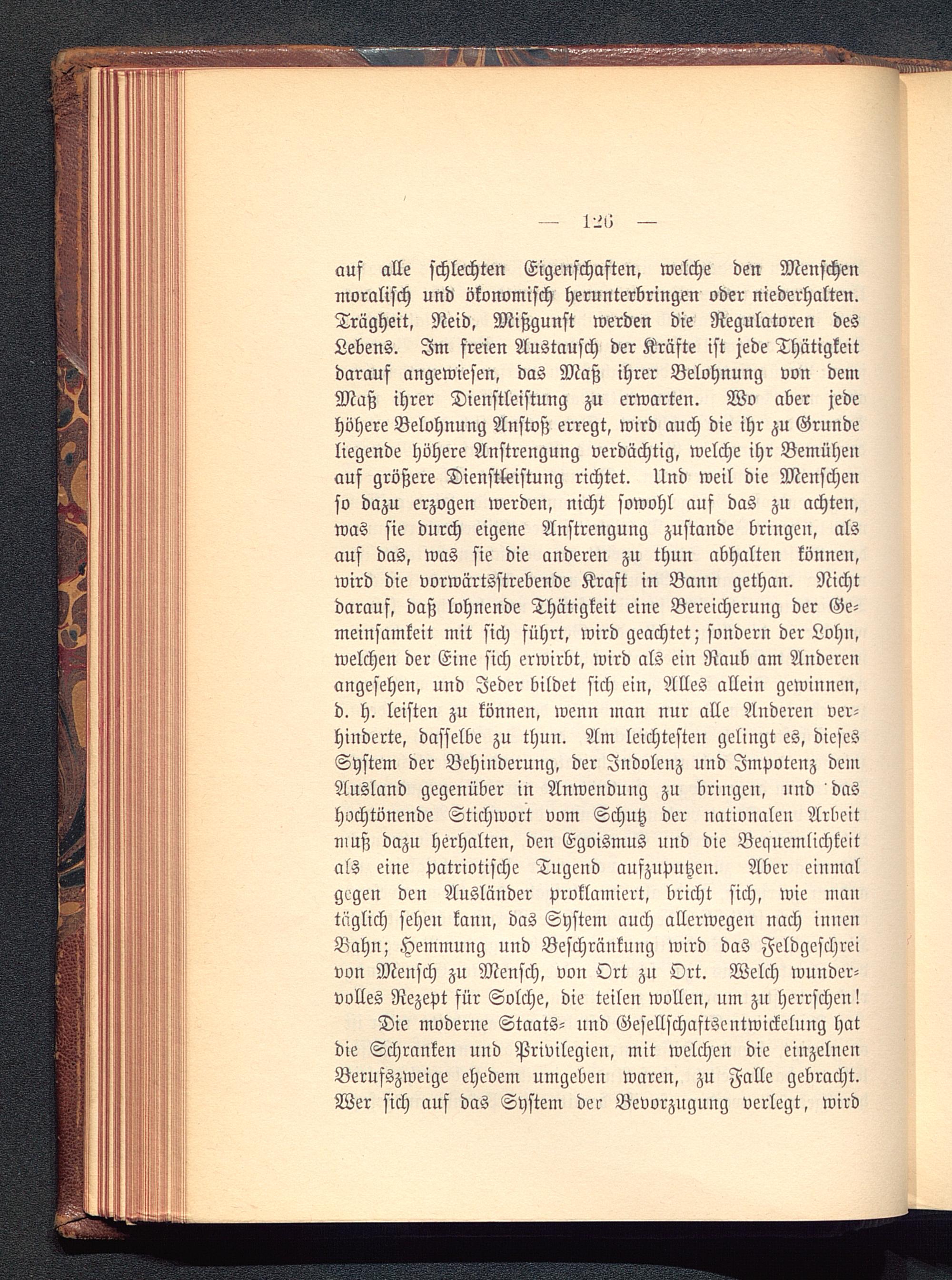 auf alle schlechten Eigenschaften, welche den Menschenmoralisch und ökonomisch herunterbringen oder niederhalten.Trägheit, Neid, Mißgunst werden die Regulatoren desLebens. Im freien Austausch der Kräfte ist jede Thätigkeitdarauf angewiesen, das Maß ihrer Belohnung von demMaß ihrer Dienstleistung zu erwarten. Wo aber jedehöhere Belohnung Anstoß erregt, wird auch die ihr zu Grundeliegende höhere Anstrengung verdächtig, welche ihr Bemühenauf größere Dienstleistung richtet. Und weil die Menschenso dazu erzogen werden, nicht sowohl auf das zu achten,was sie durch eigene Anstrengung zustande bringen, alsauf das, was sie die anderen zu thun abhalten können,wird die vorwärtsstrebende Kraft in Bann gethan. Nichtdarauf, daß lohnende Thätigkeit eine Bereicherung der Ge-meinsamkeit mit sich führt, wird geachtet; sondern der Lohn,welchen der Eine sich erwirbt, wird als ein Raub am Anderenangesehen, und Jeder bildet sich ein, Alles allein gewinnen,d. h. leisten zu können, wenn man nur alle Anderen ver-hinderte, dasselbe zu thun. Am leichtesten gelingt es, diesesSystem der Behinderung, der Indolenz und Impotenz demAusland gegenüber in Anwendung zu bringen, und dashochtönende Stichwort vom Schutz der nationalen Arbeitmaß dazu herhalten, den Egoismus und die Bequemlichkeitals eine patriotische Tugend aufzuputzen. Aber einmalgegen den Ausländer proklamiert, bricht sich, wie mantäglich sehen kann, das System auch allerwegen nach innenBahn; Hemmung und Beschränkung wird das Feldgeschreivon Mensch zu Mensch, von Ort zu Ort. Welch wunder-volles Rezept für Solche, die teilen wollen, um zu herrschen!