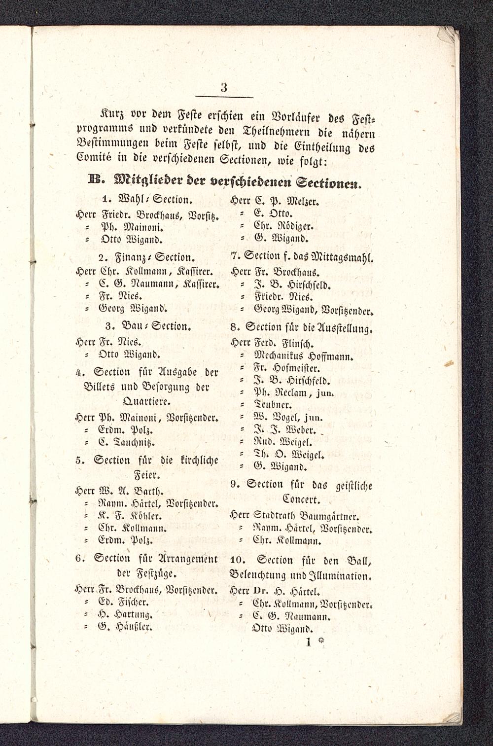 Kurz vor dem Feste erschien ein Vorlaufer des Fest-Programms und verkündete den Theilnehmern die nahernBestimmungen beim Feste selbst, und die Einteilung deSComite in die verschiedenen Sectionen, wie folgt: