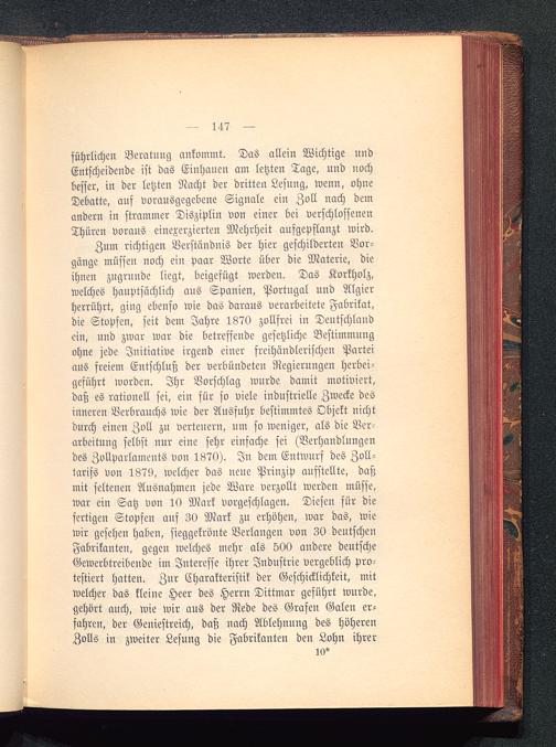 Zum richtigen Verständnis der hier geschilderten Vor-gänge müssen noch ein Paar Worte über die Materie, dieihnen zugrunde liegt, beigefügt werden. Das Korkholz,welches hauptsächlich aus Spanien, Portugal und Algier herrührt, giug ebenso wie das daraus verarbeitete Fabrikat,die Stopfen, seit dem Jahre 1870 zollfrei in Deutschland ein, und zwar war die betreffende gesetzliche Bestimmungohne jede Initiative irgend einer freihändlerischen Parteiaus freiem Entschluß der Verbündeten Negierungen herbei-geführt worden. Ihr Vorschlag wurde damit motiviert,daß es rationell sei, ein für so viele industrielle Zwecke desinneren Verbrauchs wie der Ausfuhr bestimmtes Objekt uichtdurch einen Zoll zu verteuern, um so weniger, als die Ver-arbeitung selbst nur eine sehr einfache sei (Verhandlungendes Zollparlameuts von 1870). In dem Entwurf des Zoll-tarifs von 1879, welcher das neue Prinzip aufstellte, daßmit seltenen Ausnahmen jede Ware verzollt werden müsse,war ein Satz von 10 Mark vorgeschlagen. Diesen für diefertigen Stopfen auf 30 Mark zu erhöhen, war das, wiewir gesehen haben, sieggekrönte Verlangen von 30 deutschenFabrikanten, gegen welches mehr als 500 andere deutscheGewerbtreibende im Interesse ihrer Industrie vergeblich pro-testiert hatten. Zur Charakteristik der Geschicklichkeit, mitwelcher das kleine Heer des Herrn Dittmar geführt wurde,gehört auch, wie wir aus der Rede des Grafen Galen er-fahren, der Geniestreich, daß nach Ablehnung des höherenZolls in zweiter Lesung die Fabrikanten den Lohn ihrer