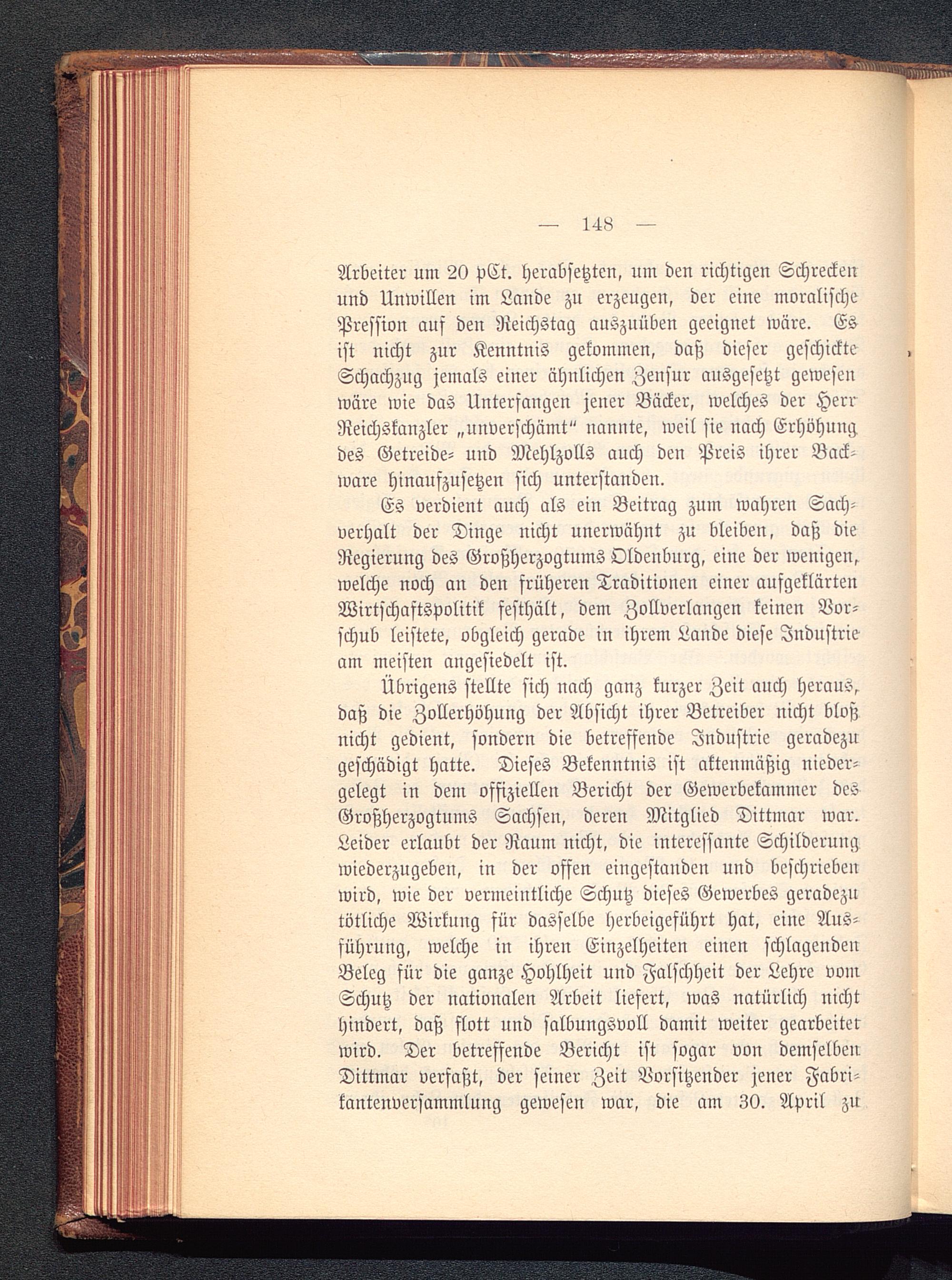 Übrigens stellte sich nach ganz kurzer Zeit auch heraus,daß die Zollerhöhung der Absicht ihrer Betreiber nicht bloßnicht gedient, sondern die betreffende Industrie geradezugeschädigt hatte. Dieses Bekenntnis ist aktenmäßig nieder-gelegt in dem offiziellen Bericht der Gewerbekammer desGroßherzogtums Sachsen, deren Mitglied Dittmar war.Leider erlaubt der Raum nicht, die interessante Schilderungwiederzugeben, in der offen eingestanden und beschriebenwird, wie der vermeintliche Schntz dieses Gewerbes geradezutätliche Wirkung für dasselbe herbeigeführt hat, eine Aus-führung, welche in ihren Einzelheiten einen schlagendenBeleg für die ganze Hohlheit und Falschheit der Lehre vomSchutz der nationalen Arbeit liefert, was natürlich nichthindert, daß flott und salbungsvoll damit weiter gearbeitetwird. Der betreffende Bericht ist sogar von demselbenDittmar verfaßt, der seiner Zeit Vorsitzender jener Fabri-kantenversammlung gewesen war, die am 30. April zu