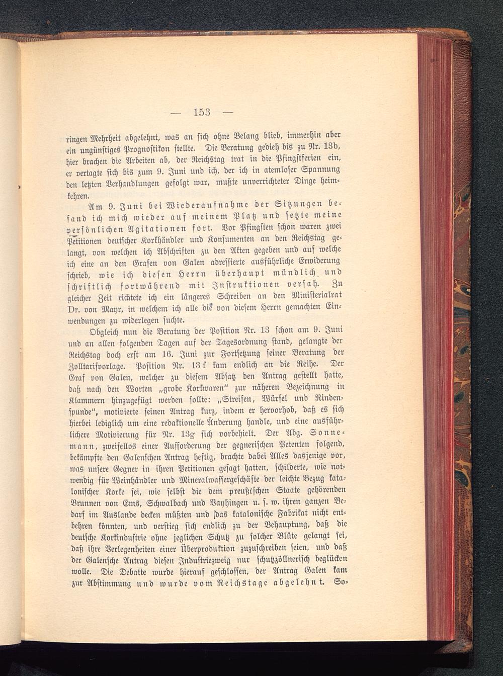 Am 9. Juni bei Wiederaufnahme der Sitzungen be-fand ich mich wieder auf meinem Platz und setzte meinepersönlichen Agitationen fort. Vor Pfingsten schon waren zweiPetitionen deutscher Korkhändlcr und Konsumenten an den Reichstag ge-langt, von welchen ich Abschriften zu den Akten gegeben und auf welcheich eine an den Grafen von Galen adressierte ausführliche Erwiderungschrieb, wie ich diesen Herrn überhaupt mündlich undschriftlich fortwährend mit Instruktionen versah. Zugleicher Zeit richtete ich ein längeres Schreiben an den MinisterialratDr. von Mayr, in welchem ich alle die von diesem Herrn gemachten Ein-wendungen zu widerlegen suchte.