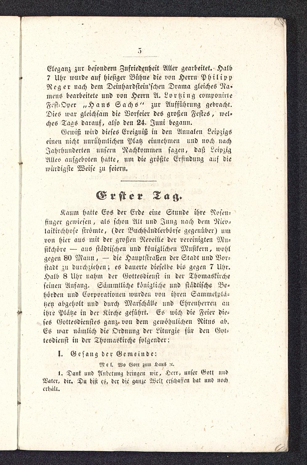 Eleganz zur besondern Zufriedenheit Aller gearbeitet. Halb7 Uhr wurde auf hiesiger Bühne die von Herrn PhilippReger nach dem Deinhardstein'schen Drama gleiches Na«mens bearbeitete und von Herrn A. Lortzing cornponirteFest-Oper „Hans Sachs " zur Aufführung gebracht.Dies war gleichsam die Vorfeier des großen Festes, wel-ches Tags darauf, also den 24. Juni begann.