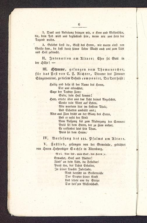 III. Hymne, gesungen vom Thomanerchor,für das Fest von C. F. Nichter, Director des Zittauer Sängervereins, zu diesem Behufe e o m p o n i r t. Dcr Text heißt: