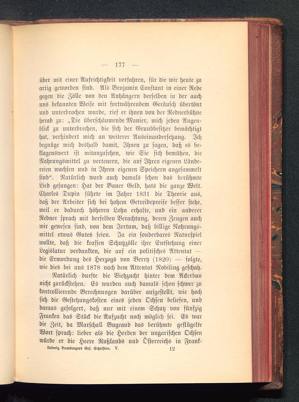 über mit einer Aufrichtigkeit verfahren, für die wir heute zuartig geworden sind. Als Benjamin Constant in einer Redegegen die Zölle von den Anhängern derselben in der auchuns bekannten Weise mit fortwährendem Geräusch übertöntund unterbrochen wurde, rief er ihnen von der Reduerbühneherab zu: „Die überschäumende Manier, mich jeden Augen-blick zu unterbrechen, die sich der Grundbesitzer bemächtigthat, verhindert mich an weiterer Auseinandersetzung. Ichbegnüge mich deshalb damit, Ihnen zu sagen, daß es be-klagenswert ist mitanznsehen, wie Sie sich bemüheu, dieNahrungsmittel zu verteuern, die auf Ihren eigenen Lände-reien wachsen und in Ihren eigenen Speichern angesammeltsind". Natürlich ward auch damals schon das berühmteLied gesungen: Hat der Bauer Geld, hats die ganze Welt.Charles Dupin führte im Jahre 1831 die Theorie aus,daß der Arbeiter sich bei hohem Getreidepreise besser stehe,weil er dadurch höhereu Lohn erhalte, uud eiu andererRedner sprach mit derselben Verachtung, deren Zeugen auchwir gewesen sind, von dem Irrtum, daß billige Nahrungs-mittel etwas Gutes seieu. Ja ein sonderbares Natnrspielwollte, daß die krassen Schutzzölle ihre Entstehung einerLegislatur verdankten, die auf ein politisches Attentat -die Ermordung des Herzogs von Berry (1820) — folgte,wie dies bei uns 1878 nach dem Attentat Nobiliug geschah.