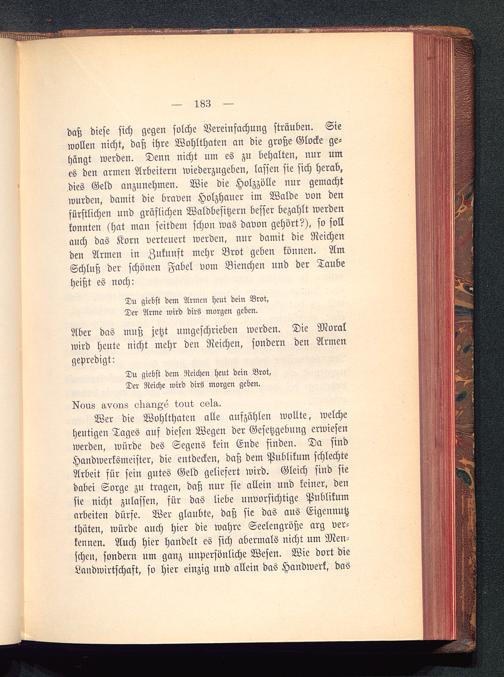 daß diese sich gegen solche Vereinfachung sträuben. Siewollen nicht, daß ihre Wohlthaten an die große Glocke ge-hängt werden. Denn nicht um es zu behalten, nur umes den armen Arbeitern wiederzugeben, lassen sie sich herab,dies Geld anzunehmen. Wie die Holzzölle nur gemachtwurden, damit die braven Holzhauer im Walde von denfürstlichen und gräflichen Waldbesitzern besser bezahlt werdenkonnten (hat man seitdem schon was davon gehört?), so sollauch das Korn verteuert werden, nur damit die Reichenden Armen in Zukunft mehr Brot geben können. AmSchluß der schönen Fabel vom Bienchen und der Taubeheißt es noch: