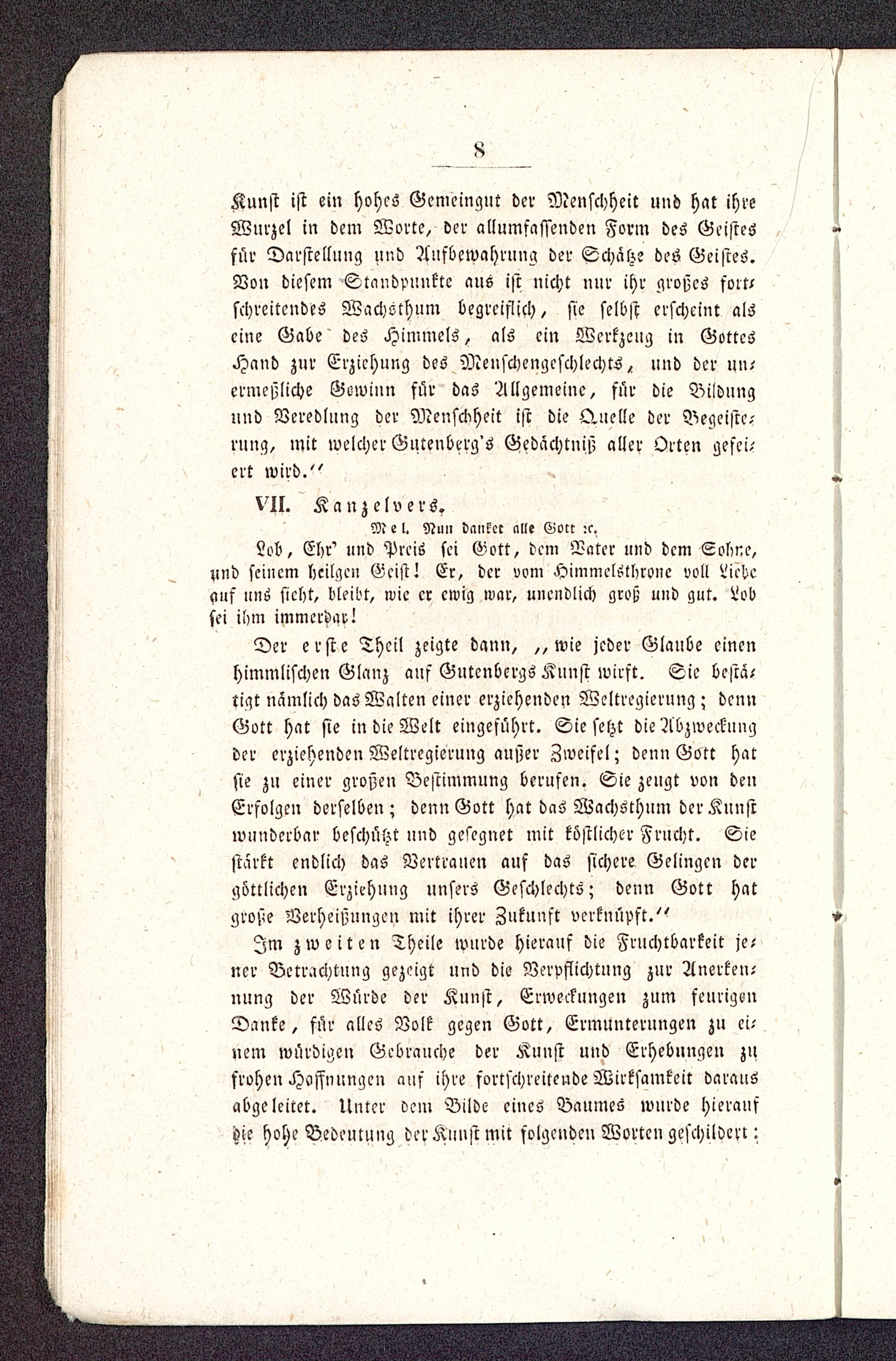 Kunst ist ein hohcs Gemeingut der Menschheit und hat ihreWurzel in dem Worte, der allumfassenden Form des Geistesfür Darstellung und Aufbewahrung der Schatze deö Geistes.Von diesem Standpunkte aus ist nicht nur ihr großes forttschreitendes Wachsthum begreiflich, sie selbst erscheint alseine Gabe des Himmels, als ein Werkzeug in GottesHand zur Erziehung des Menschengeschlechts, und der iiiuermeßliche Gewinn für das Allgemeine, für die Bildungund Veredlung der Menschheit ist die Quelle der Begeiste-rung, mit welcher Gutenbcrg's Gedächtniß aller Orten gefei-ert wird."