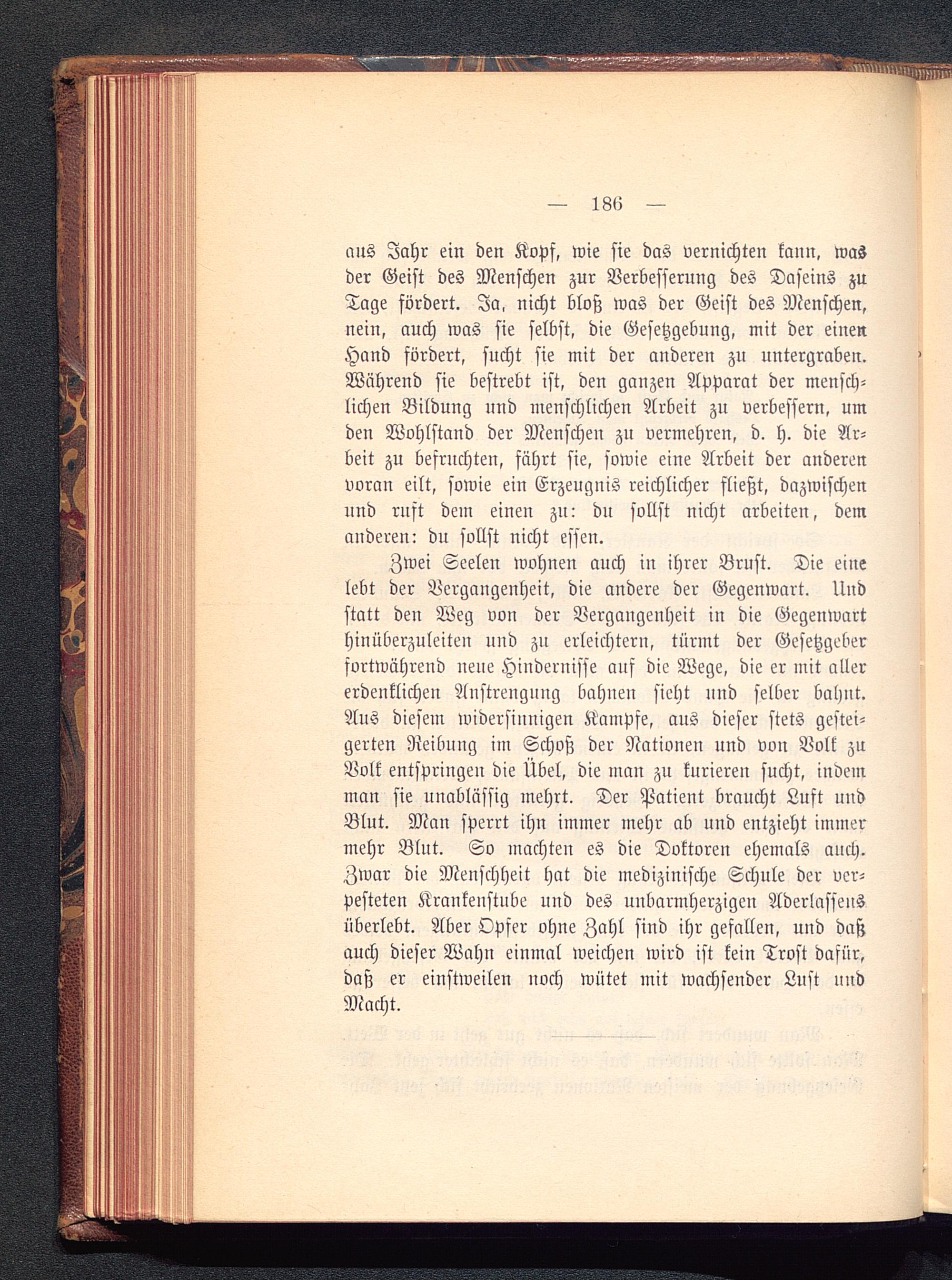 Zwei Seelen wohnen auch in ihrer Brust. Die einelebt der Vergangenheit, die andere der Gegenwart. Undstatt den Weg von der Vergangenheit in die Gegenwarthin überzuleiten und zu erleichtern, türmt der Gesetzgeberfortwährend nene Hindernisse ans die Wege, die er mit allererdenklichen Anstrengung bahnen sieht und selber bahnt.Aus diesem widersinnigen Kampfe, aus dieser stets gestei-gerten Reibung im Schoß der Nationen und von Volk zuVolk entspringen die Übel, die man zu kurieren sucht, indemman sie unablässig mehrt. Der Patient braucht Luft undBlut. Man sperrt ihn immer mehr ab und entzieht immermehr Blut. So machteu es die Doktoren ehemals auch.Zwar die Menschheit hat die medizinische Schule der ver-pesteten Krankenstube und des unbarmherzigen Aderlassensüberlebt. Aber Opfer ohne Zahl sind ihr gefallen, und daßauch dieser Wahn einmal weichen wird ist kein Trost dafür,daß er einstweilen noch wütet mit wachsender Lnst undMacht.