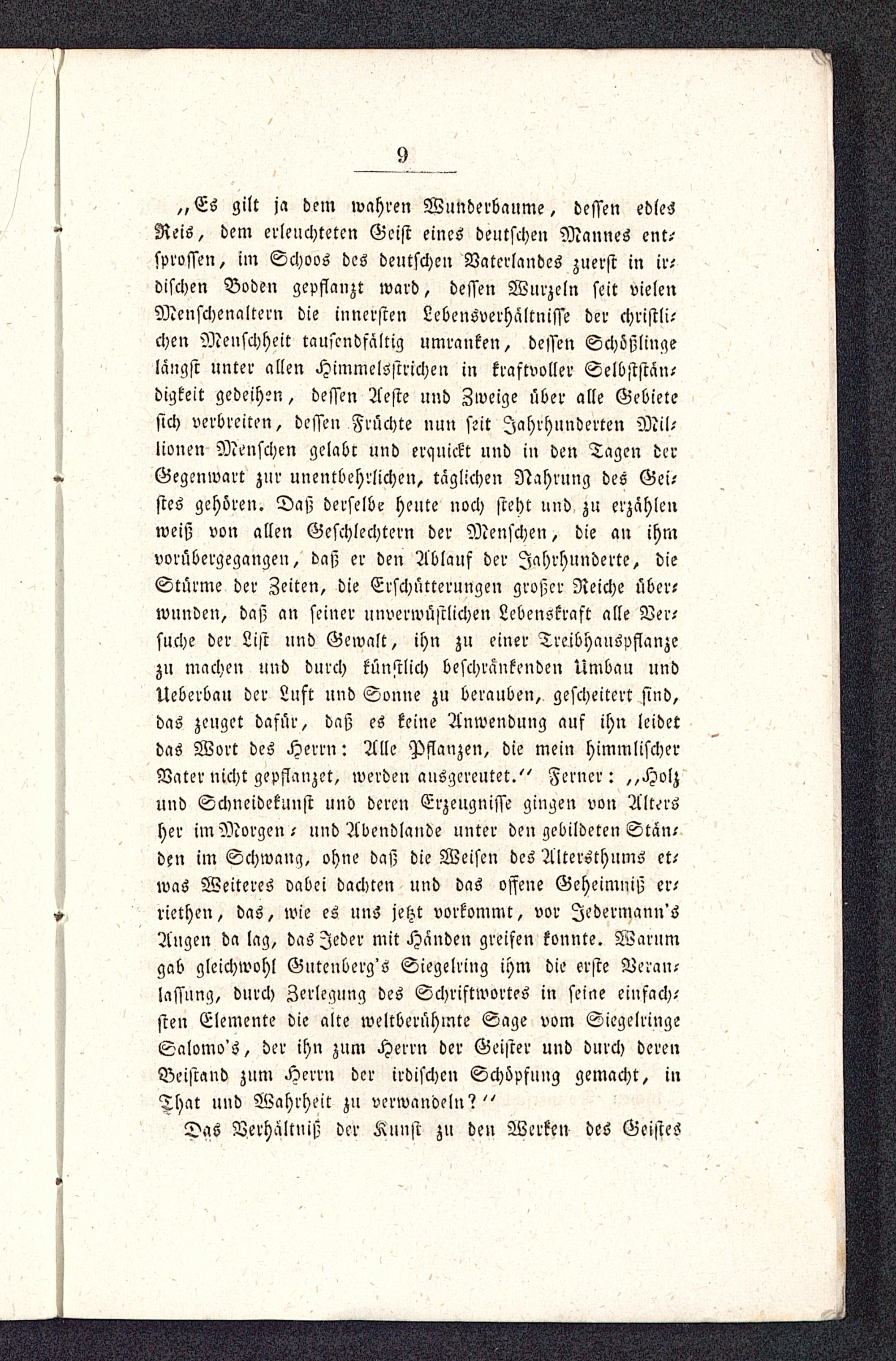 „ Es gilt ja dem wahren Wunderbaume, dessen edlesReis, dem erleuchteten Geist eines deutschen Mannes musprossen, im Schoos des deutschen Vaterlandes zuerst in ipdischen Boden gepflanzt ward, dessen Wurzeln seit vielenMenschenaltern die innersten Lebensverhältnisse der christli-chen Menschheit tausendfältig umranken, dessen Schößlingelängst unter allen Himmelsstrichen in kraftvoller Selbststan-digkeit gedeihen, dessen Zteste und Zweige über alle Gebietesich verbreiten, dessen Früchte nun seit Jahrhunderten Mil-lionen Menschen gelabt und erquickt und in den Tagen derGegenwart zur unentbehrlichen, täglichen Nahrung des Gei-sres gehören. Daß derselbe heute noch steht und. zu erzählenweiß von allen Geschlechtern der Menschen, die an ihmvorübergegangen, daß er den Ablauf der Jahrhunderte, dieStürme der Zeiten, die Erschütterungen großer Reiche über-wunden, daß an seiner unverwüstlichen Lebenskraft alle Ver-suche der List und Gewalt, ihn zu einer Treibhauspflanzezu machen und durch künstlich beschrankenden Umbau undUeberbau der Luft und Sonne zu berauben^ gescheitert sind,das zeuget dasür, daß es keine Anwendung ans ihn leidetdas Wort des Herrn: Alle Pflanzen, die mein himmlischerVater nicht gepflauzet, werden ausgerenket." Ferner: ,,Holzund Schneidekunst und deren Erzeugnisse gingen von Altersher imMorgen- und Abendlande unter den gebildeten Stän-den im Schwang, ohne daß die Weisen des AltersthumS et-was Weiteres vabei dachten und das offene Geheimniß er/riethen, das, wie es uns jetzt vorkommt, vor Iedermann'sAugen da lag, das Jeder mit Händen greifen konnte. Warumgab gleichwohl Gutcnberg's Siegelring ihm die erste Neran?lassung, durch Zerlegung des Schriftwortes in seine einfach-sten Elemente die alte weltberühmte Sage vom SiegelringeSalomo's, der ihn zum Herrn der Geister und durch derenBeistand zum Herrn der irdischen Schöpfung gemacht, inThat und Wahrheit zu verwandeln?"