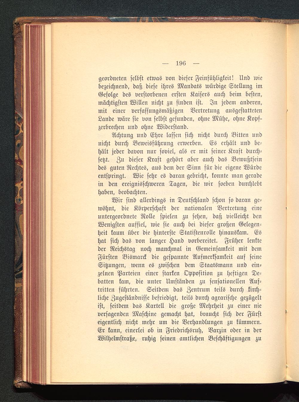 Wir sind allerdings in Deutschland schon so daran ge-wöhnt, die Körperschaft der nationalen Vertretung eineuntergeordnete Rolle spielen zu sehen, daß vielleicht denWenigsten auffiel, wie sie auch bei dieser großen Gelegen-heit kaum über die hinterste Statistenrolle hinauskam. Eshat sich das von langer Hand vorbereitet. Früher lenkteder Reichstag noch manchmal in Gemeinsamkeit mit demFürsten Bismarck die gespannte Aufmerksamkeit auf seineSitzungen, wenn es zwischen dem Staatsmann und ein-zelnen Parteien einer starken Opposition zu heftige» De-batten kam, die unter Umständen zu sensationellen Auf-tritten führten. Seitdem das Zentrum teils durch kirch-liche Zugeständnisse befriedigt, teils durch agrarische gezügeltist, seitdem das Kartell die große Mehrheit zu einer nieversagenden Maschine gemacht hat, braucht sich der Fürsteigentlich nicht mehr um die Verhandlungen zu kümmern.Er kann, einerlei ob in Friedrichsruh, Varzin oder in derWilhelmstraße, ruhig seinen amtlichen Beschäftigungen zu