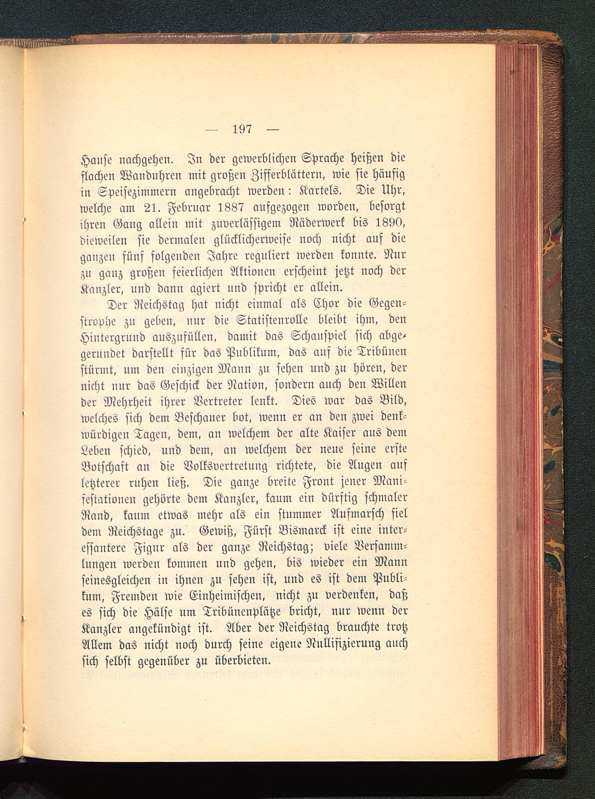 Hanse nachgehen. In der gewerblichen Sprache heißen dieflachen Wanduhren mit großen Zifferblättern, wie sie häufigin Speisezimmern angebracht werden: Kartels. Die Uhr,welche am 21. Februar 1887 aufgezogen worden, besorgtihren Gang allein mit zuverlässigem Räderwerk bis 1899,dieweilen sie dermale» glücklicherweise noch nicht auf dieganzen fünf folgenden Jahre reguliert werden konnte. Nurzu ganz großen feierlichen Aktionen erscheint jetzt noch derKanzler, und daun agiert und spricht er allein.