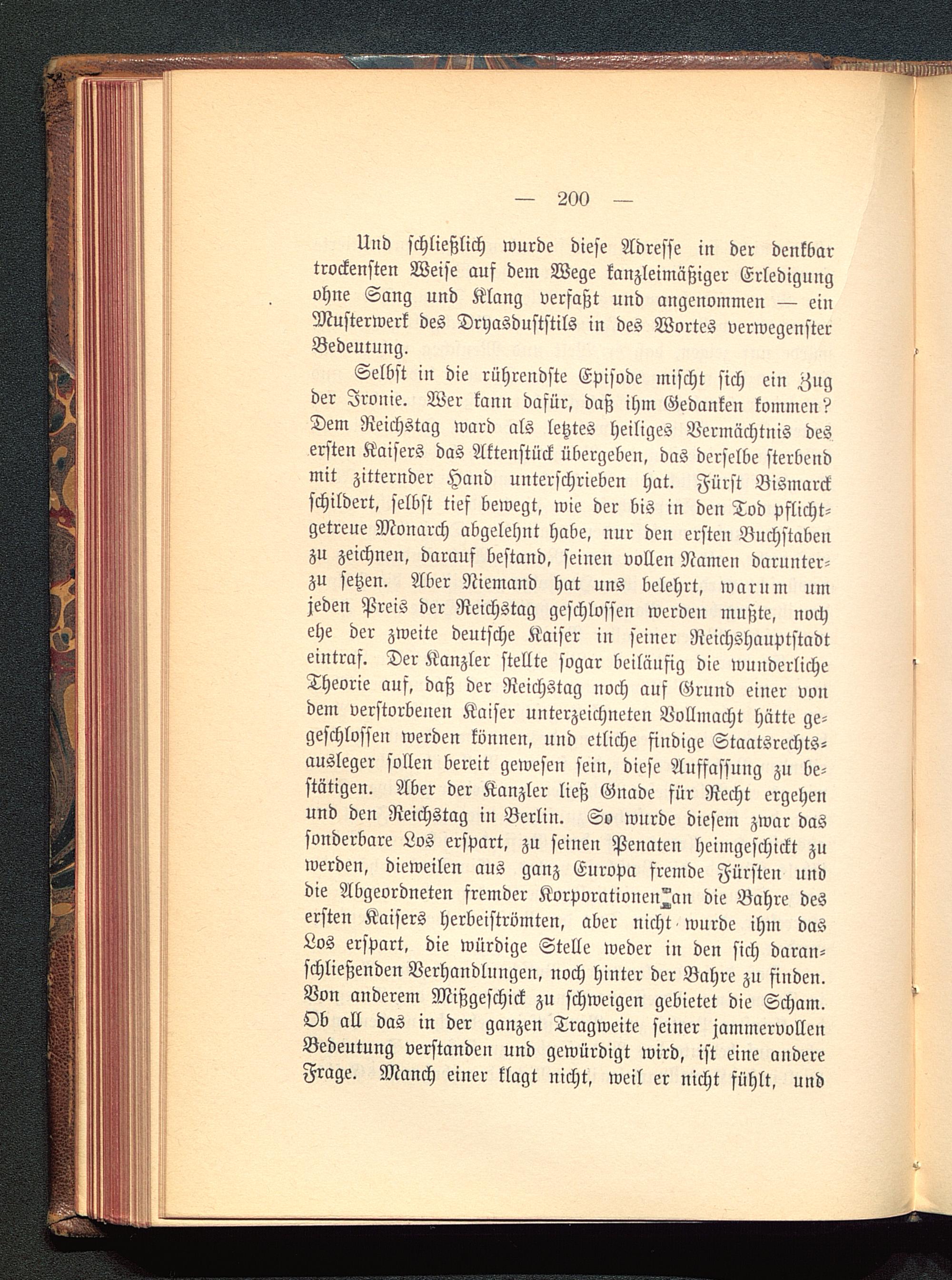 Selbst in die rührendste Episode mischt sich ein Zugder Ironie. Wer kann dafür, daß ihm Gedanken kommen?Dem Reichstag ward als letztes heiliges Vermächtnis desersten Kaisers das Aktenstück übergeben, das derselbe sterbendmit zitternder Hand unterschrieben hat. Fürst Bismarck schildert, selbst tief bewegt, wie der bis in den Tod pflicht-getreue Monarch abgelehnt habe, nur den ersten Buchstabenzu zeichnen, darauf bestand, seinen vollen Namen darunter-zu setzen. Aber Niemand hat uns belehrt, warum umjeden Preis der Reichstag geschlossen werden mußte, nochehe der zweite deutsche Kaiser iu seiner Reichshauptstadteintraf. Der Kanzler stellte sogar beiläufig die wunderlicheTheorie auf, daß der Reichstag noch auf Grund einer vondem verstorbenen Kaiser unterzeichneten Vollmacht hätte ge-geschlossen werden können, und etliche findige Staatsrechts-ausleger sollen bereit gewesen sein, diese Auffassung zu be-stätigen. Aber der Kanzler ließ Gnade für Recht ergehenund den Reichstag in Berlin . So wurde diesem zwar dassonderbare Los erspart, zu seinen Penateu heimgeschickt zuwerden, dieweilen aus ganz Europa fremde Fürsten unddie Abgeordneten fremder Korporationen^«!! die Bahre desersten Kaisers herbeiströmten, aber nicht wurde ihm dasLos erspart, die würdige Stelle weder in den sich daran-schließenden Verhandlungen, noch hinter der Bahre zu finden.Von anderem Mißgeschick zu schweigen gebietet die Scham.Ob all das in der ganzen Tragweite seiner jammervollenBedeutung verstanden und gewürdigt wird, ist eine andereFrage. Manch einer klagt nicht, weil er nicht fühlt, und