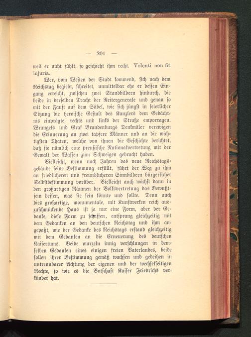 Vielleicht, wenn nach Jahren das neue Reichstags-gebäude seiue Bestimmung erfüllt, führt der Weg zu ihman friedlicheren und freundlicheren Sinnbildern bürgerlicherSelbstbestimmung vorüber. Vielleicht auch wächst dann inden großartigen Räumen der Volksvertretung das Bewußt-sein dessen, was sie sein könnte und sollte. Denn auchdies großartige, monumentale, mit Kunstwerken reich aus-zuschmückende Haus ist ja nur eine Form, aber der Ge-danke, diese Form zu schaffen, entsprang gleichzeitig mitdem Gedanken au den deutschen Reichstag und ihm an-gepaßt, wie der Gedanke des Reichstags erstand gleichzeitigmit dem Gedanken an die Erneuerung des deutschenKaisertums. Beide wnrzeln innig verschlungen in dem-selben Gedanken eines einigen freien Vaterlandes, beidesollen ihrer Bestimmung gemäß wachsen und gedeihen inuntrennbarer Achtung der eigenen und der wechselseitigenRechte, so wie es die Botschaft Kaiser Friedrichs ver-kündet hat.