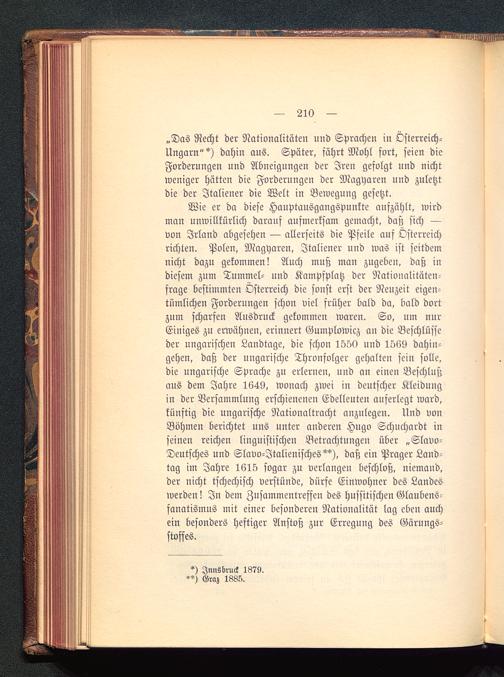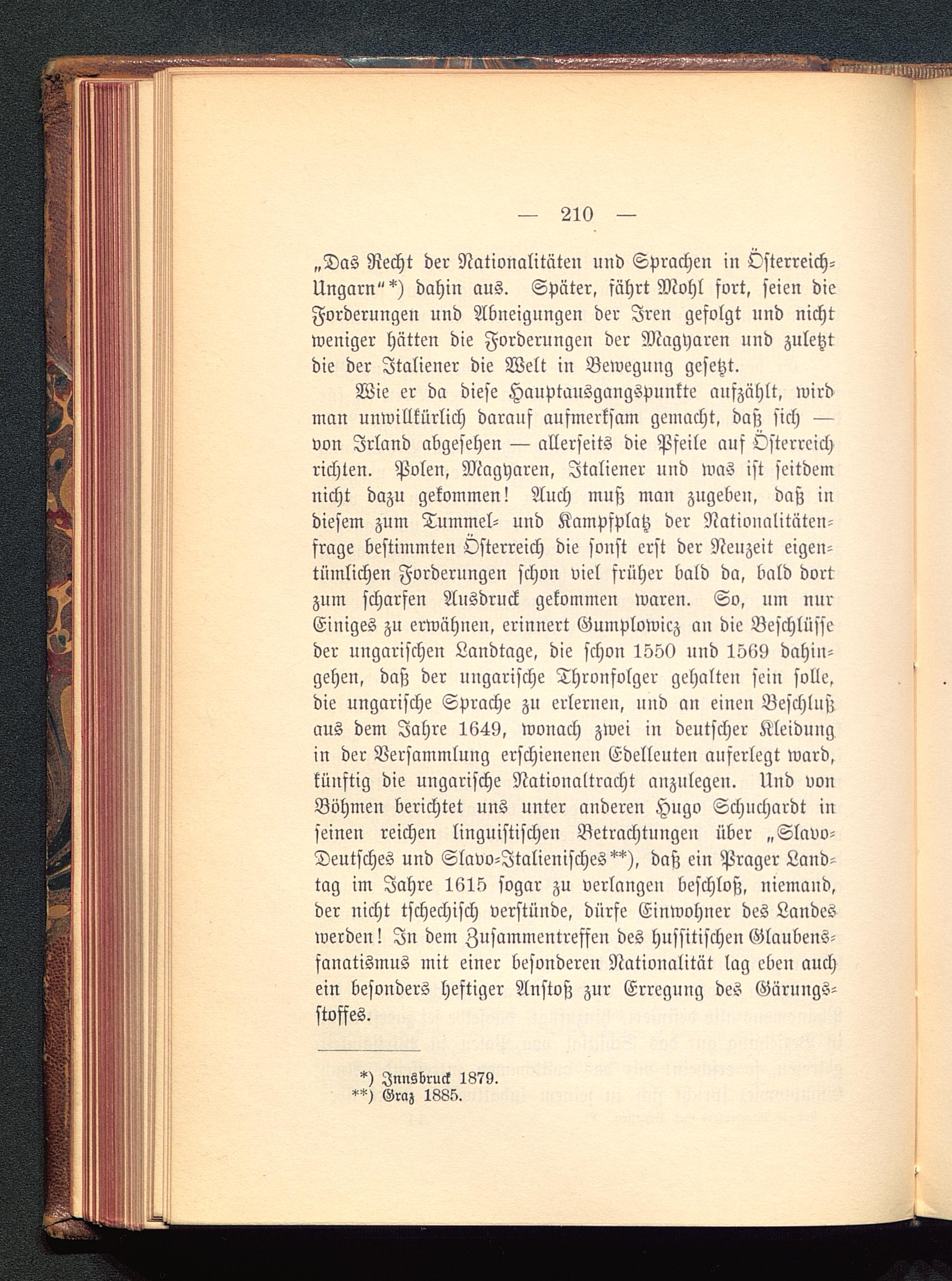 Wie er da diese Hauptausgaugspunkte aufzählt, wirdman unwillkürlich darauf aufmerksam gemacht, daß sich —von Irland abgesehen — allerseits die Pfeile auf Osterreich richten. Polen , Magyaren, Italiener und was ist seitdemnicht dazu gekommen! Auch muß man zugeben, daß indiesem zum Tummel- und Kampfplatz der Nationalitäten-frage bestimmten Österreich die sonst erst der Neuzeit eigen-tümlichen Forderungen schon viel früher bald da, bald dortzum scharfen Ausdruck gekommen waren. So, um nurEiniges zu erwähnen, erinnert Gumplowicz an die Beschlüsseder ungarischen Landtage, die schon 1550 und 1569 dahin-gehen, daß der ungarische Thronfolger gehalten sein solle,die ungarische Sprache zu erlerne», und an einen Beschlußaus dem Jahre 1649, wonach zwei in deutscher Kleidungin der Versammlung erschienenen Edelleuten auferlegt ward,künftig die ungarische Nationaltracht anzulegen. Und vonBöhmen berichtet uns unter anderen Hugo Schuchardt inseinen reichen linguistischen Betrachtungen über „Slavo-Deutsches und Slavo-Jtalienisches**), daß ein Prager Land-tag im Jahre 1615 sogar zu verlangen beschloß, niemand,der nicht tschechisch verstünde, dürfe Einwohner des Landeswerden! In dem Zusammentreffen des hussitischen Glaubens-fanatismus mit einer besonderen Nationalität lag eben auchein besonders heftiger Anstoß zur Erregung des Gärungs-stoffes.