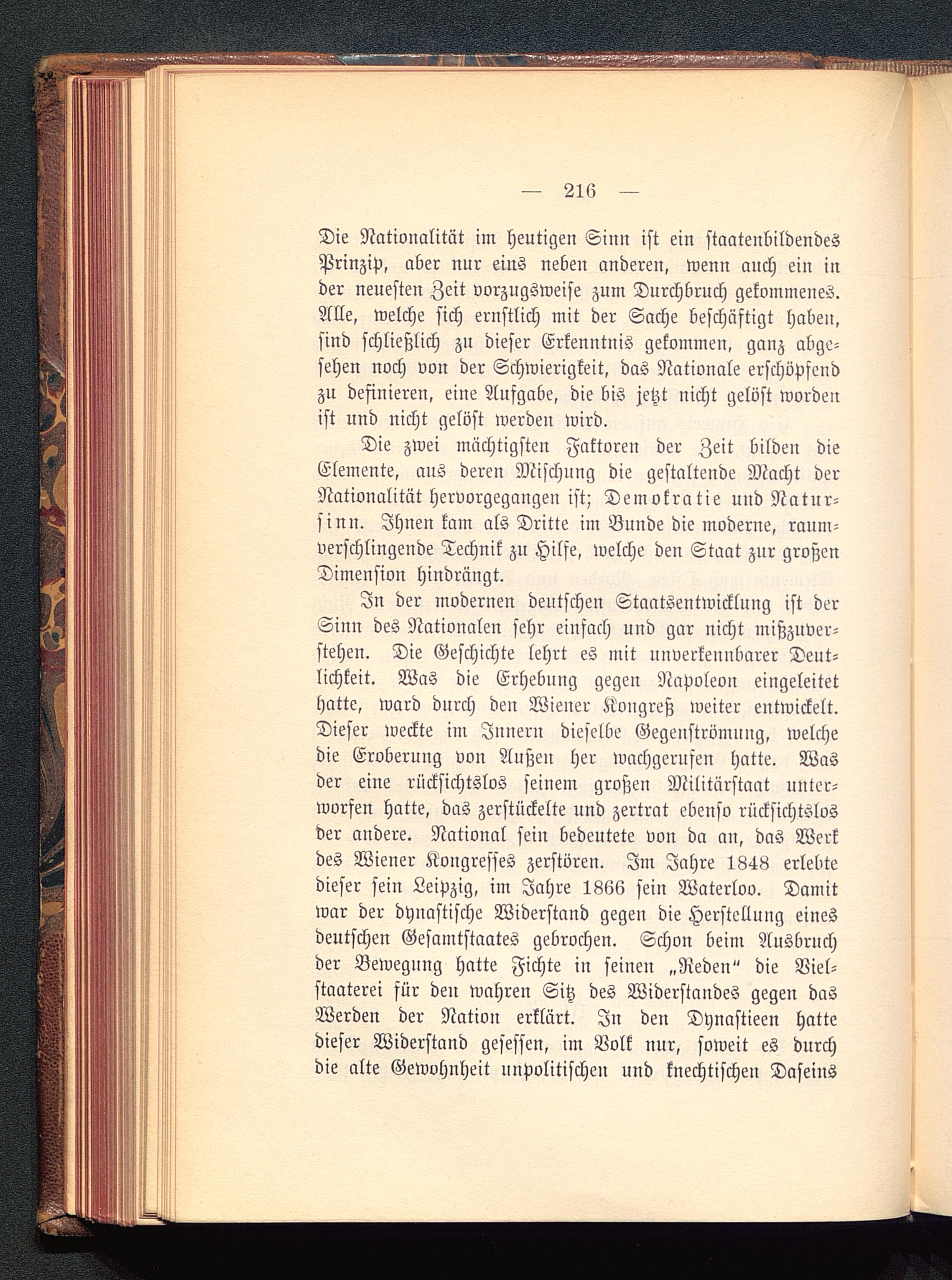 In der modernen deutschen Staatsentwickluug ist derSinn des Nationalen sehr einfach und gar nicht mißzuver-stehen. Die Geschichte lehrt es mit nnverkeunbarer Deut-lichkeit. Was die Erhebung gegen Napoleon eingeleitethatte, ward durch den Wiener Kongreß weiter entwickelt.Dieser weckte im Innern dieselbe Gegenströmung, welchedie Eroberung von Außeu her wachgerufen hatte. Wasder eine rücksichtslos seinem großen Militärstaat unter-worfen hatte, das zerstückelte und zertrat ebenso rücksichtslosder andere. National sein bedeutete von da an, das Werkdes Wiener Kongresses zerstören. Im Jahre 1848 erlebtedieser sein Leipzig , im Jahre 1866 sein Waterloo. Damitwar der dynastische Widerstand gegeu die Herstellung einesdeutschen Gesamtstaates gebrochen. Schon beim Ausbruchder Bewegung hatte Fichte in seinen „Reden" die Viel-staaterei für den wahren Sitz des Widerstandes gegen dasWerden der Nation erklärt. In den Dynastieen hattedieser Widerstand gesessen, im Volk nur, soweit es durchdie alte Gewohnheit unpolitischen und knechtischen Daseins