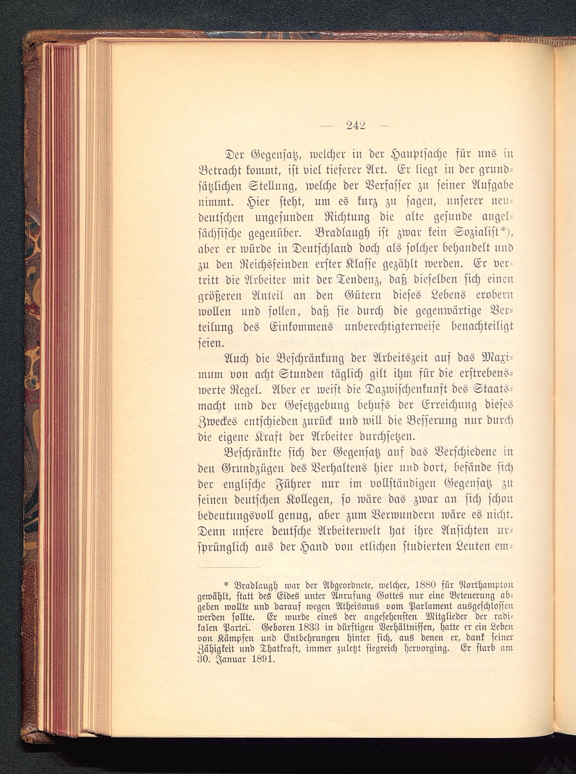 * Bradlaugh war der Abgeordnete, welcher, 1889 für Northampton gewählt, statt des Eides unter Anrufung Gottes nur eine Beteuerung ab-geben wollte und darauf wegen Atheismus vom Parlament ausgeschlossenwerden sollte. Er wurde eines der angesehensten Mitglieder der radi-kalen Partei. Geboren 1833 in dürftigen Verhältnissen, hatte er ein Lebenvon Kämpfen und Entbehrungen hinter sich, aus denen er, dank seinerZähigkeit und Thatkraft, immer zuletzt siegreich hervorging. Er starb am30. Januar 18!>1.