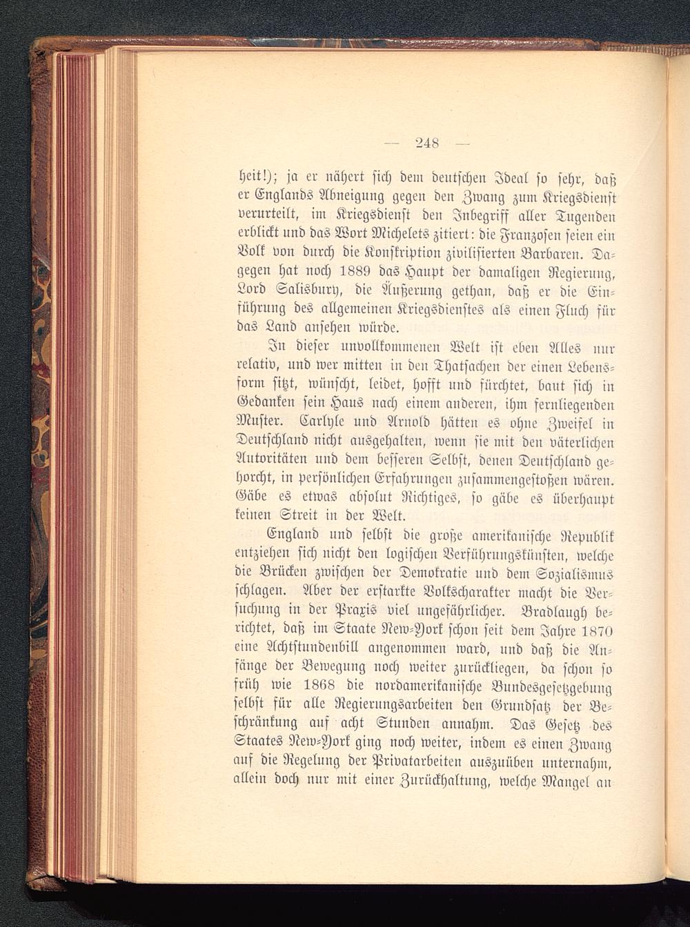 heit!); ja er nähert sich dein deutschen Ideal so sehr, daßer Englands Abneigung gegen den Zwang zum Kriegsdienstverurteilt, im Kriegsdienst den Inbegriff aller Tugendenerblickt und das Wort Michelets zitiert: die Franzosen seien einVolk von durch die Konskription zivilisierten Barbaren. Da-gegen hat noch 1889 das Haupt der damaligen Negierung,Lord Salisburp, die Äußerung gethan, daß er die Ein-führung des allgemeinen Kriegsdienstes als einen Flnch fürdas Land ansehen würde.
