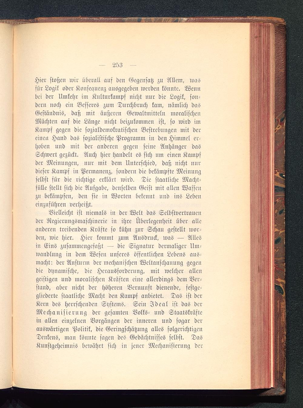 Hier stoßen wir überall auf den Gegensatz zu Allem, wasfür Logik oder Konsequenz ausgegeben werden könnte. Wennbei der Umkehr im Kulturkampf nicht nur die Logik, son-dern noch eiu Besseres zum Durchbruch kam, uämlich dasGeständnis, daß mit äußeren Gewaltmitteln moralischenMächten auf die Länge nicht beizukommen ist, so wird imKampf gegen die sozialdemokratischen Bestrebungen mit dereinen Hand das sozialistische Programm in den Himmel er-hoben und mit der anderen gegen seine Anhänger dasSchwert gezückt. Auch hier handelt es sich um einen Kampfder Meinungen, nur mit dem Unterschied, daß nicht nurdieser Kampf in Permanenz, sondern die bekämpfte Meinungselbst für die richtige erklärt wird. Die staatliche Macht-fülle stellt sich die Aufgabe, denselben Geist mit allen Waffenzu bekämpfen, den sie in Worten bekennt und ins Lebeneinzuführen verheißt.