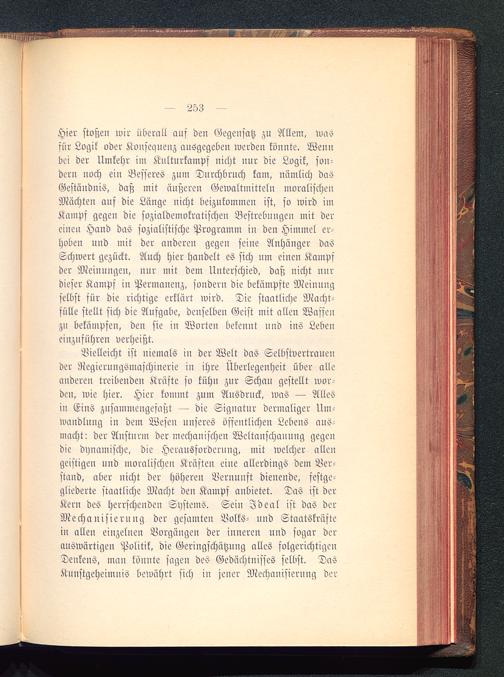 Vielleicht ist niemals in der Welt das Selbstvertrauender Regiernngsmaschinerie in ihre Überlegenheit über alleanderen treibenden Kräfte so kühn zur Schau gestellt wor-den, wie hier. Hier kommt zum Ausdruck, was — Allesin Eins zusammengefaßt — die Signatur dermaliger Um-wandlung in dem Wesen unseres öffentliche» Lebens aus-macht: der Ansturm der mechanischen Weltanschauung gegendie dynamische, die Herausforderung, mit welcher allengeistigen und moralischen Kräften eine allerdings dem Ver-stand, aber nicht der höheren Vernunft dienende, festge-gliederte staatliche Macht den Kamps anbietet. Das ist derKern des herrschenden Systems. Sein Ideal ist das derMechanisierung der gesamten Volks- und Staatskräftein allen einzelnen Vorgängen der inneren nnd sogar derauswärtigen Politik, die Geringschätzung alles folgerichtigenDenkens, man könnte sagen des Gedächtnisses selbst. DaSKunstgeheiinnis bewährt sich in jener Mechanisierung der