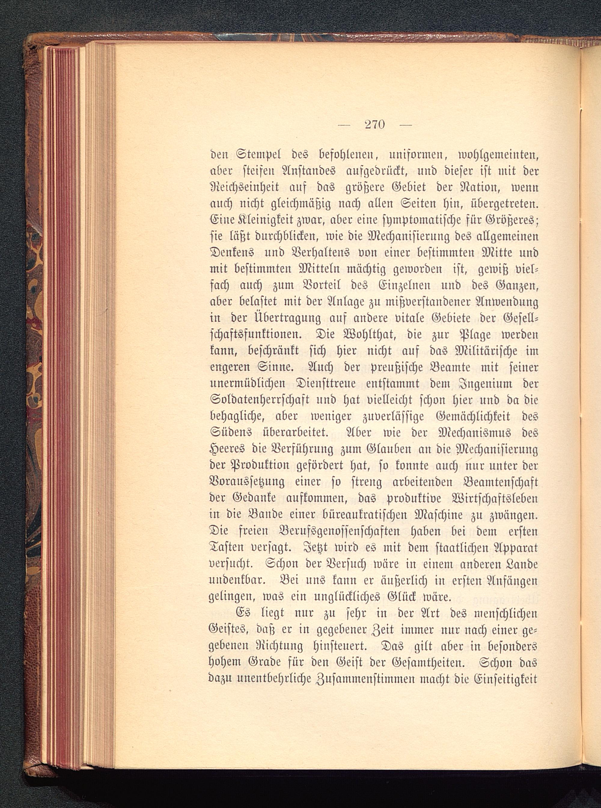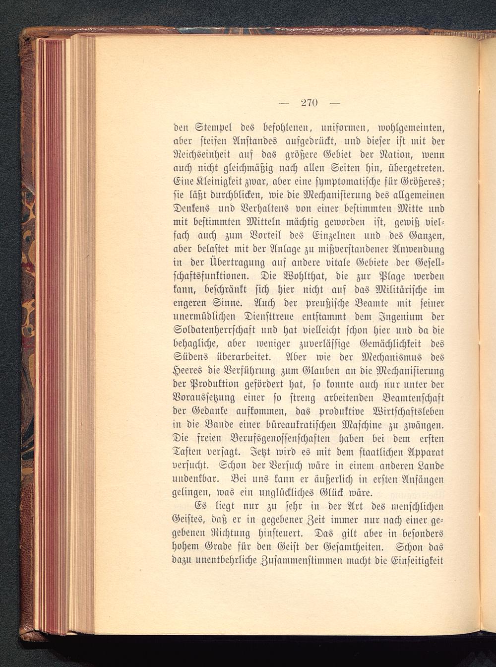 den Stempel des befohlene», uniformen, wohlgemeinten,aber steifen Anstandes aufgedrückt, und dieser ist mit derReichseinheit auf das größere Gebiet der Nation, wennauch nicht gleichmäßig uach allen Seiten hin, übergetreten.Eine Kleinigkeit zwar, aber eine symptomatische für Größeres;sie läßt durchblicken, wie die Mechanisierung des allgemeinenDenkens und Verhaltens von einer bestimmten Mitte undmit bestimmten Mitteln mächtig geworden ist, gewiß viel-fach anch zum Vorteil des Einzelnen und des Ganzen,aber belastet mit der Anlage zu mißverstandener Anwendungin der Übertragung auf andere vitale Gebiete der Gesell-schaftsfnnktionen. Die Wohlthat, die zur Plage werdenkann, beschränkt sich hier nicht auf das Militärische imengeren Sinne. Auch der preußische Beamte mit seinerunermüdlichen Diensttreue entstammt dem Ingenium derSoldatenherrschaft und hat vielleicht schon hier und da diebehagliche, aber weniger zuverlässige Gemächlichkeit desSüdens überarbeitet. Aber wie der Mechanismus desHeeres die Verführung zum Glauben an die Mechanisierungder Produktion gefördert hat, so konnte auch uur unter derVoraussetzung einer so streng arbeitenden Beamtenschaftder Gedanke aufkommen, das produktive Wirtschaftslebenin die Bande einer büreaukratischen Maschine zu zwängen.Die freien Berufsgeuosfenschaften haben bei dem erstenTasten versagt. Jetzt wird es mit dem staatlichen Apparatversucht. Schon der Versuch wäre in einem anderen Landeundenkbar. Bei uns kann er äußerlich in ersten Anfängengelingen, was ein unglückliches Glück wäre.