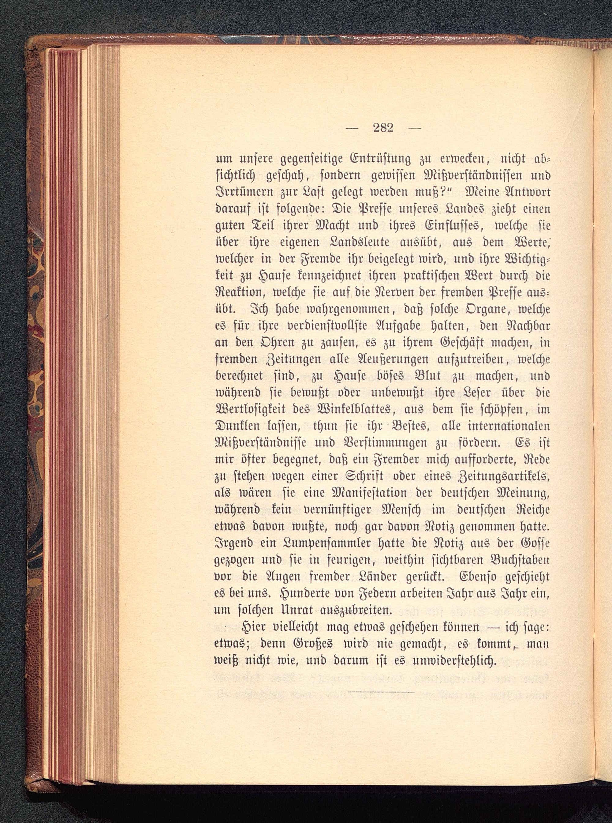 um unsere gegenseitige Entrüstung zu erwecken, nicht ab-sichtlich geschah, sondern gewissen Mißverständnissen undIrrtümern zur Last gelegt werden muß?" Meine Antwortdarauf ist folgende: Die Presse unseres Landes zieht einenguten Teil ihrer Macht und ihres Einflusses, welche sieüber ihre eigenen Landsleute ausübt, aus dem Werte,welcher in der Fremde ihr beigelegt wird, und ihre Wichtig-keit zu Hause kennzeichnet ihren praktischen Wert durch dieReaktion, welche sie auf die Nerven der fremden Presse aus-übt. Ich habe wahrgenommen, daß solche Organe, welchees für ihre verdienstvollste Aufgabe halten, den Nachbaran den Ohren zu zausen, es zu ihrem Geschäft machen, infremden Zeitungen alle Aeußerungen aufzutreiben, welcheberechnet sind, zu Hause böses Blut zu macheu, undwährend sie bewußt oder unbewußt ihre Leser über dieWertlosigkeit des Winkelblattes, aus dem sie schöpfen, imDunklen lasfen, thun sie ihr Bestes, alle internationalenMißverständnisse und Verstimmungen zu fördern. Es istmir öfter begegnet, daß ein Fremder mich aufforderte, Redezu stehen wegen einer Schrift oder eines Zeitungsartikels,als wären sie eine Manifestation der deutschen Meinung,während kein vernünftiger Mensch im deutschen Reicheetwas davon wußte, noch gar davon Notiz genommen hatte.Irgend ein Lumpensammler hatte die Notiz aus der Gossegezogen und sie in feurigen, weithin sichtbaren Buchstabenvor die Augen fremder Länder gerückt. Ebenso geschiehtes bei uns. Hunderte von Federn arbeiten Jahr aus Jahr ein,um solchen Unrat auszubreiten.