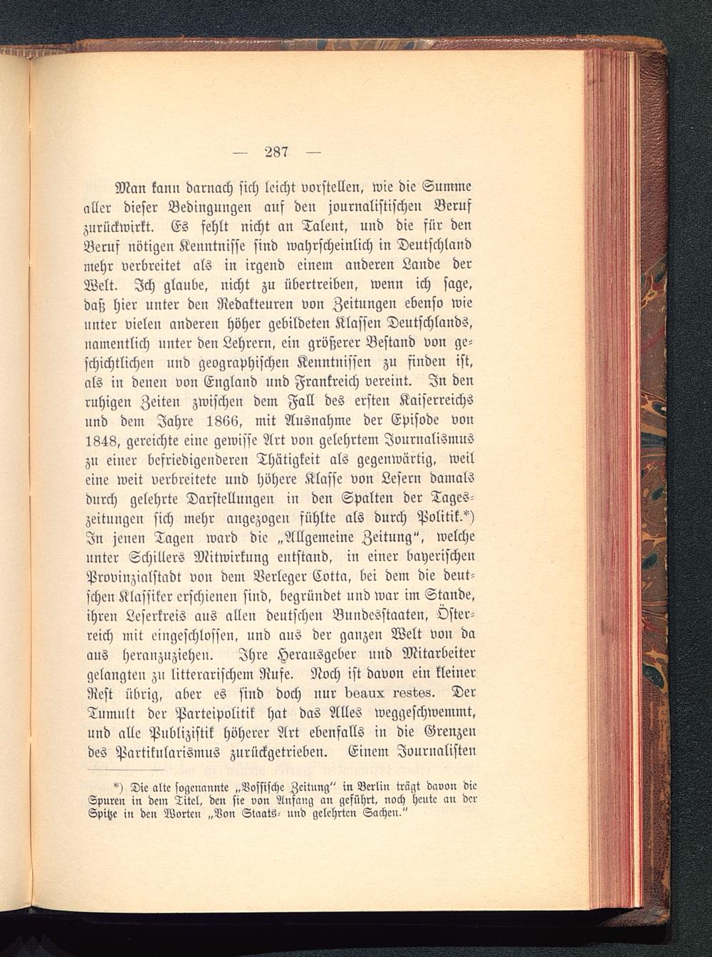 Man kann darnach sich leicht vorstellen, wie die Summealler dieser Bedingungen ans den journalistischen Berufzurückwirkt. Es fehlt nicht an Talent, und die für denBeruf nötigen Kenntnisse sind wahrscheinlich in Deutschland mehr verbreitet als in irgend einem anderen Lande derWelt. Ich glaube, nicht zu übertreibe», wenn ich sage,das; hier unter den Redakteuren von Zeitungen ebenso wieunter vieleu anderen höher gebildeten Klassen Deutschlands ,namentlich unter den Lehrern, ein größerer Bestand von ge-schichtlichen und geographischen Kenntnissen zu finden ist,als in denen von England nnd Frankreich vereint. In denruhigen Zeiten zwischen dem Fall des ersten Kaiserreichsund dem Jahre 1866, mit Ausnahme der Episode von1848, gereichte eiue gewisse Art vou gelehrtem Journalismuszu einer befriedigenderen Thätigkeit als gegenwärtig, weileine weit verbreitete und höhere Klasse von Lesern damalsdurch gelehrte Darstellungen in den Spalten der Tages-zeitungen sich mehr angezogen suhlte als durch Politik.^In jenen Tagen ward die „Allgemeine Zeitung ", welcheunter Schillers Mitwirkung entstand, in einer bayerischenProvinzialstadt von dein Verleger Cottn, bei dem die deut-schen Klassiker erschienen sind, begründet nnd war im Stande,ihren Leserkreis ans allen deutschen Bnndesstaaten, Öster-reich mit eingeschlossen, und ans der ganzen Welt von daaus heranzuziehen. Ihre Herausgeber und Mitarbeitergelangten zu litterarischem Rufe. Noch ist davon ein kleinerRest übrig, aber es find doch nur dsaux rssdss. DerTumult der Parteipolitik hat das Alles weggeschwemmt,und alle Publizistik höherer Art ebenfalls in die Grenzendes Partiknlarismus zurückgetrieben. Einem Journalisten