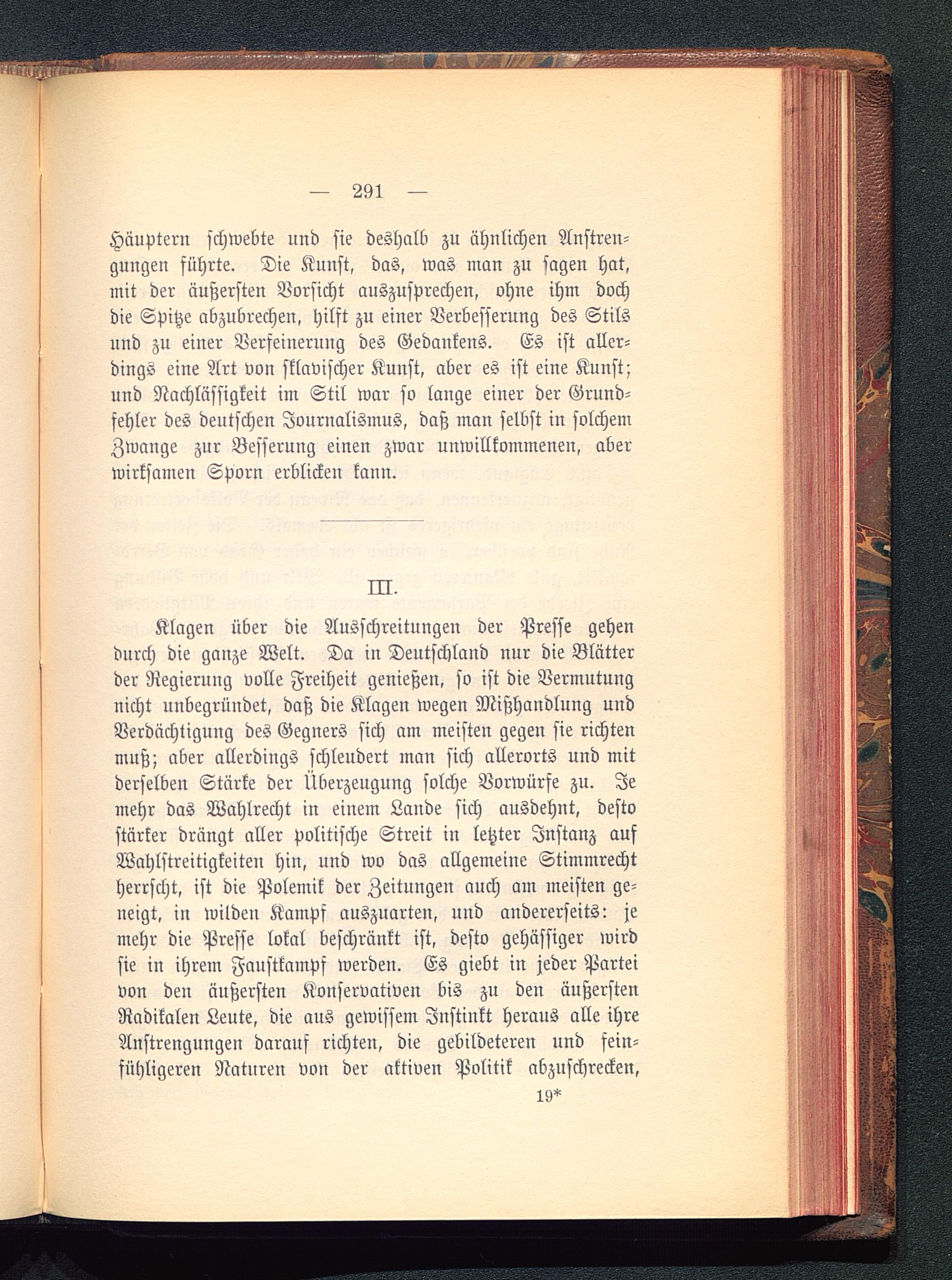 Klagen über die Ausschreitungen der Presse gehendurch die ganze Welt. Da in Deutschland nur die Blätterder Regierung volle Freiheit genießen, so ist die Vermutungnicht unbegründet, daß die Klagen wegen Mißhandlung undVerdächtigung des Gegners sich am meisten gegen sie richtenmuß; aber allerdings schleudert man sich allerorts und mitderselben Stärke der Überzeugung solche Vorwürfe zu. Jemehr das Wahlrecht in einem Lande sich ausdehnt, destostärker drängt aller politische Streit in letzter Instanz aufWahlstreitigkeiten hin, und wo das allgemeine Stimmrechtherrscht, ist die Polemik der Zeitungen auch am meisten ge-neigt, in wilden Kampf auszuarten, und andererseits: jemehr die Presse lokal beschränkt ist, desto gehässiger wirdsie in ihrem Faustkampf werden. Es giebt in jeder Parteivon den äußersten Konservativen bis zu den äußerstenRadikalen Leute, die aus gewissem Instinkt heraus alle ihreAnstrengungen darauf richten, die gebildeteren und fein-fühligeren Naturen von der aktiven Politik abzuschrecken,