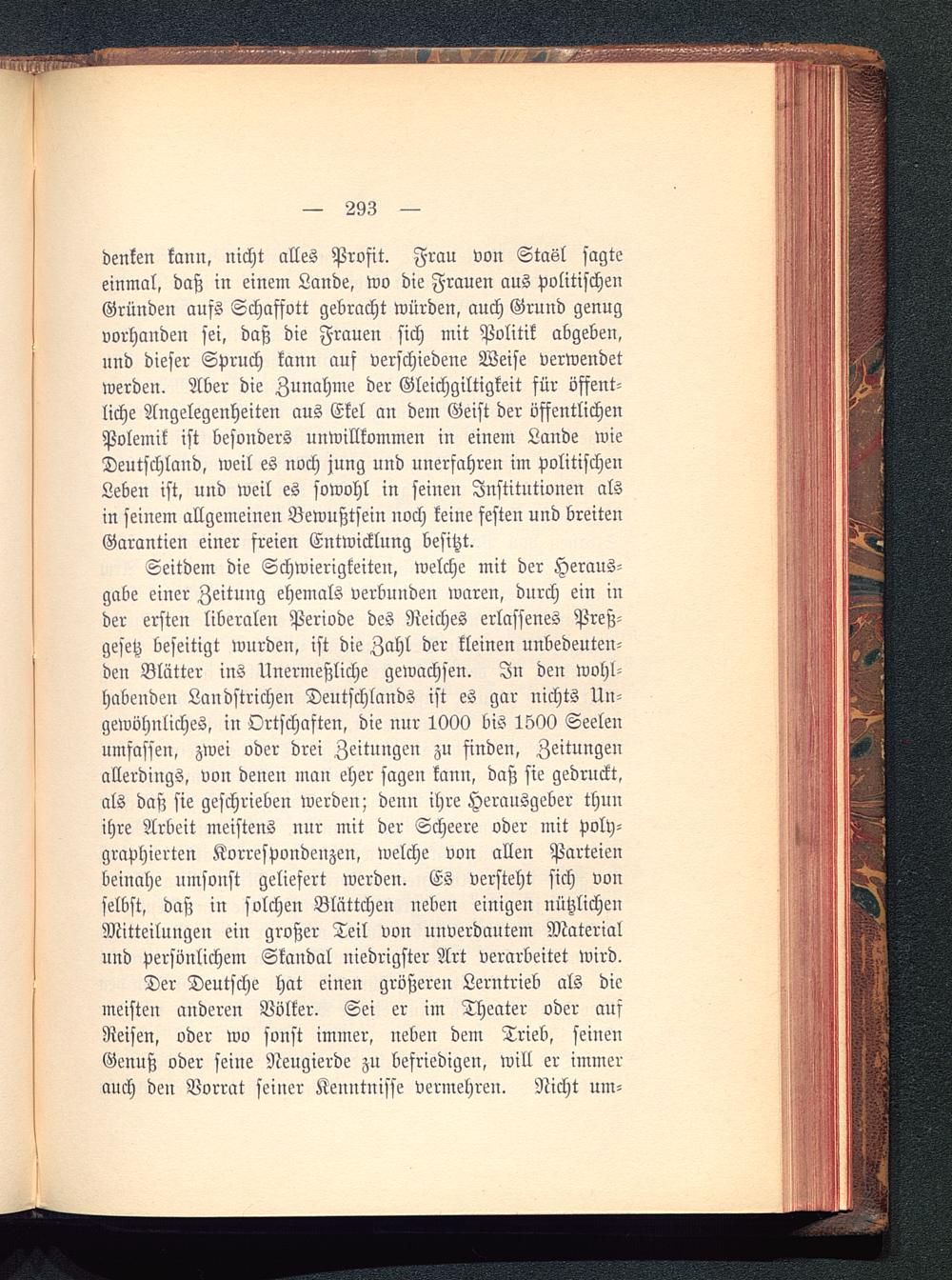 Der Deutsche hat einen größeren Lerntrieb als diemeisten anderen Völker. Sei er im Theater oder aufReisen, oder wo sonst immer, neben dem Trieb, seinenGenuß oder seine Neugierde zu befriedigen, will er immerauch den Vorrat seiner Kenntnisse vermehren. Nicht um-