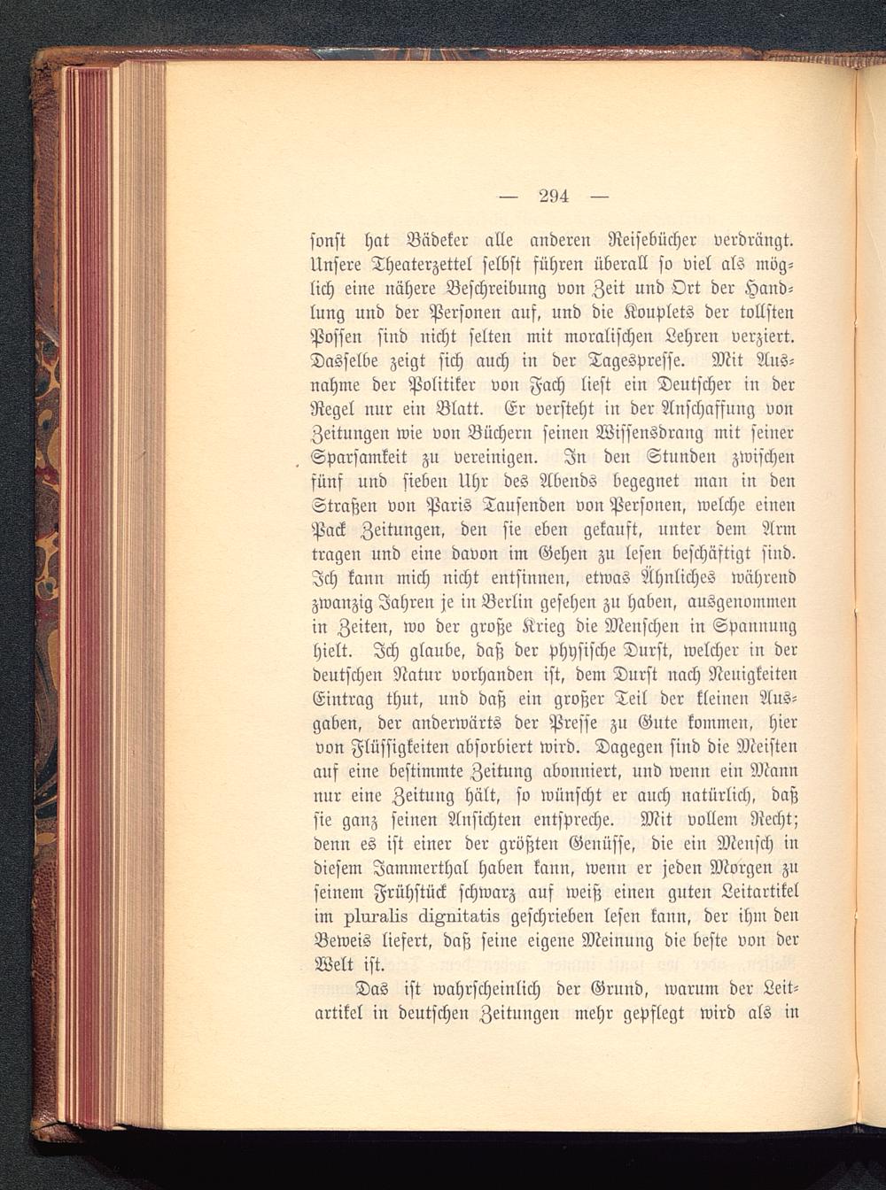 sonst hat Bädeker alle anderen Reisebücher verdrängt.Unsere Theaterzettel selbst führen überall so viel als mög-lich eine nähere Beschreibung von Zeit und Ort der Hand-lung und der Personen auf, und die Kouplets der tollstenPossen sind nicht selten mit moralischen Lehren verziert.Dasselbe zeigt sich auch in der Tagespresse. Mit Aus-nahme der Politiker von Fach liest ein Deutscher in derRegel nur eiu Blatt. Er versteht in der Anschaffung vonZeitungen wie von Büchern seinen Wissensdrang mit seinerSparsamkeit zu vereinigen. In den Stunden zwischenfünf und sieben Uhr des Abends begegnet man in denStraßen von Paris Tausenden von Personen, welche einenPack Zeitungen, den sie eben gekauft, unter dem Armtragen und eine davon im Gehen zu lesen beschäftigt sind.Ich kann mich nicht entsinnen, etwas Ähnliches währendzwanzig Jahren je in Berlin gesehen zu haben, ausgenommenin Zeiten, wo der große Krieg die Menschen in Spanuunghielt. Ich glaube, daß der physische Durst, welcher in derdeutschen Natur vorhanden ist, dem Durst nach NeuigkeitenEintrag thut, und daß ein großer Teil der kleinen Aus-gaben, der anderwärts der Presse zu Gute kommen, hiervon Flüssigkeiten absorbiert wird. Dagegen sind die Meistenauf eine bestimmte Zeitung abonniert, und wenn ein Mannnur eine Zeitung hält, so wünscht er auch natürlich, daßsie ganz seinen Ansichten entspreche. Mit vollem Recht;denn es ist einer der größten Genüsse, die ein Mensch indiesem Jammerthal haben kann, wenn er jeden Morgen zuseinem Frühstück schwarz ans weiß einen guten Leitartikelim xlui-alis cUAnitatis geschrieben lesen kann, der ihm denBeweis liefert, daß seine eigene Meinung die beste von derWelt ist.