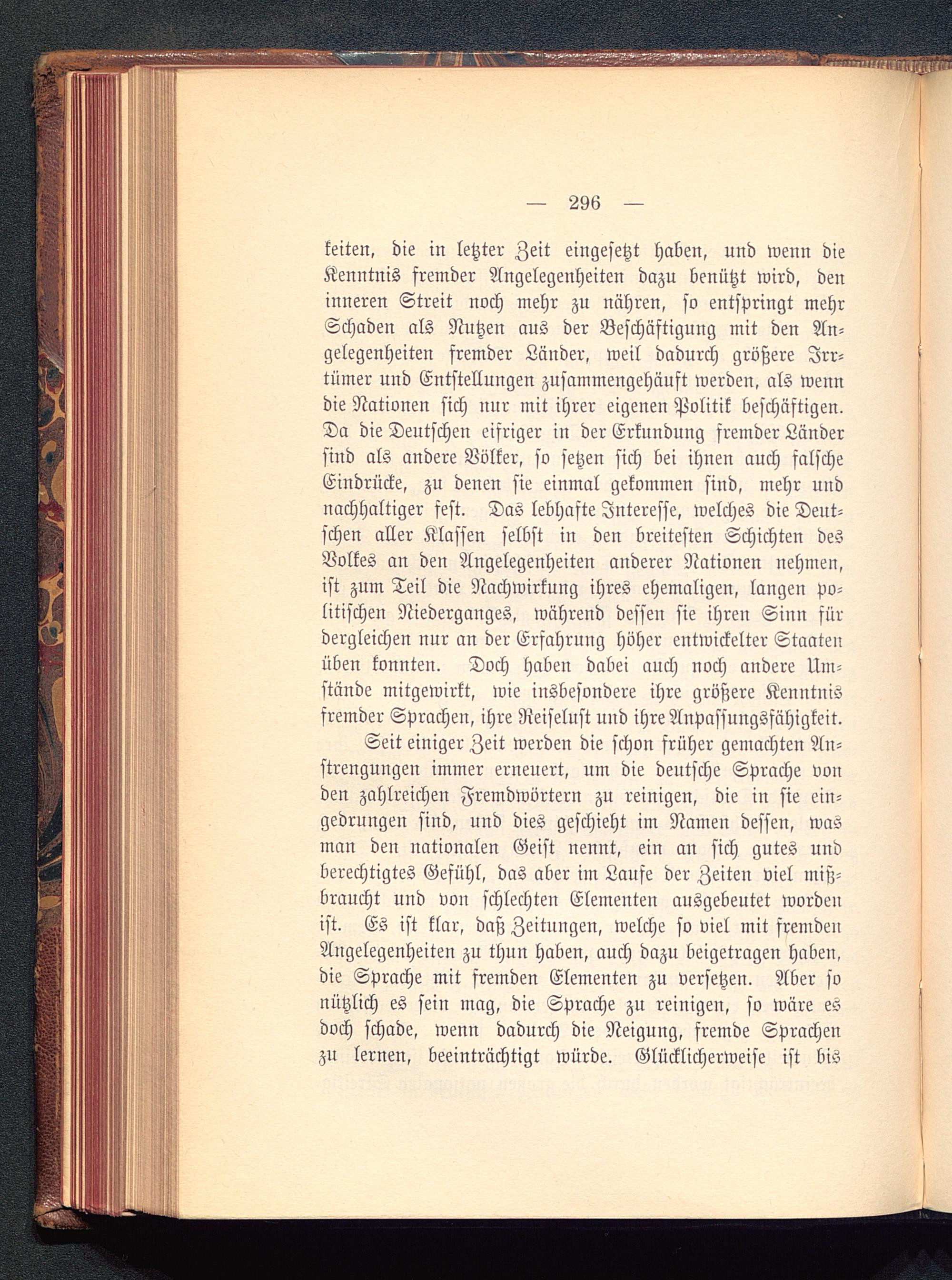 Seit einiger Zeit werden die schon früher gemachten An-strengungen immer erneuert, um die deutsche Sprache vonden zahlreichen Fremdwörtern zu reinigen, die in sie ein-gedrungen sind, und dies geschieht im Namen dessen, waSman den nationalen Geist nennt, ein an sich gutes undberechtigtes Gefühl, das aber im Laufe der Zeiten viel miß-braucht und von schlechten Elementen ausgebeutet wordenist. Es ist klar, daß Zeitungen, welche so viel mit fremdenAngelegenheiten zu thuu haben, auch dazu beigetragen haben,die Sprache mit fremden Elementen zu versetzen. Aber sonützlich es sein mag, die Sprache zn reinigen, so wäre esdoch schade, wenn dadurch die Neigung, fremde Sprachenzu lernen, beeinträchtigt würde. Glücklicherweise ist bis
