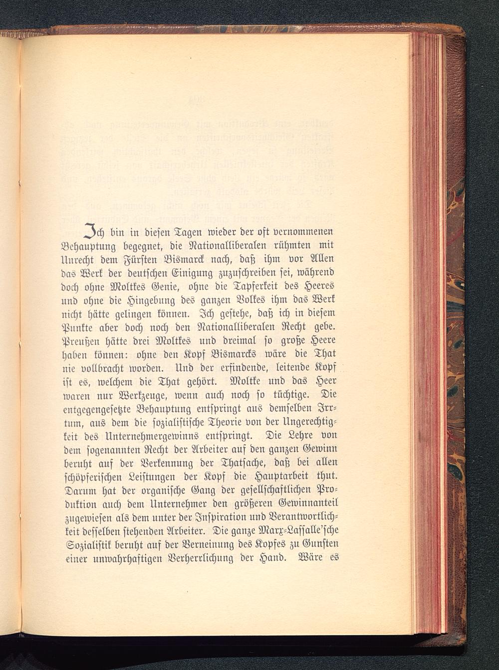 ^ch bin in diesen Tagen wieder der oft vernommenenBehauptung begegnet, die Nationalliberalen rühmten mitUnrecht dem Fürsten Bismarck nach, daß ihm vor Allendas Werk der deutschen Einigung zuzuschreiben sei, währenddoch ohne Moltkes Genie, ohne die Tapferkeit des Heeresund ohne die Hingebung des ganzen Volkes ihm das Werknicht hätte gelingen können. Ich gestehe, daß ich in diesemPunkte aber doch noch den Nationalliberalen Recht gebe.Preußen hätte drei MoltkeS und dreimal so große Heerehaben können: ohne den Kopf Bismarcks wäre die Thatnie vollbracht worden. Und der erfindende, leitende Kopfist es, welchem die That gehört. Moltke und das Heerwaren nur Werkzeuge, wenn auch noch so tüchtige. Dieentgegengesetzte Behauptung entspringt aus demselben Irr-tum, aus dem die sozialistische Theorie von der Ungerechtig-keit des Unternehmergewinns entspringt. Die Lehre vondem sogenannten Recht der Arbeiter auf den ganzen Gewinnberuht auf der Verkennung der Thatsache, daß bei allenschöpferischen Leistungen der Kopf die Hauptarbeit thut.Darum hat der organische Gang der gesellschaftlichen Pro-duktion auch dem Unternehmer den größeren Gewinnanteilzugewiesen als dem unter der Inspiration und Verantwortlich-keit desselben stehenden Arbeiter. Die ganze Marx-Lassalle 'scheSozialistik beruht auf der Verneinung des Kopfes zu Gunsteneiner nnwahrhaftigen Verherrlichung der Haud. Wäre es
