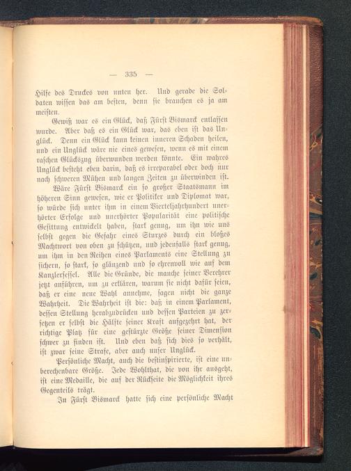 Gewiß war es ein Glück, daß Fürst Bismarck entlassenwurde. Aber daß es ein Glück war, daS eben ist das Un-glück. Denn ein Glück kann keinen inneren Schaden heilen,und ein Unglück wäre nie eines gewesen, wenn es mit einemraschen Glückszug überwunden werden könnte. Ein wahresUnglück besteht eben darin, daß es irreparabel oder doch nnrnach schweren Mühen nnd langen Zeiten zn überwinden ist.