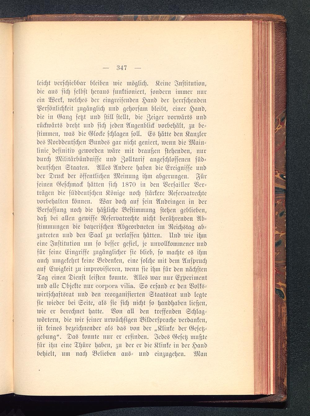 leicht verschiebbar bleiben wie möglich. Keine Institution,die ans sich selbst heraus funktioniert, sondern immer nnrein Werk, welches der eingreifenden Hand der herrschendenPersönlichkeit zuganglich und gehorsam bleibt, einer Hand,die in Gang setzt und still stellt, die Zeiger vorwärts undrückwärts dreht und sich jeden Augenblick vorbehält, zu be-stimmen, was die Glocke schlagen soll. Es hätte den Kanzlerdes Norddeutschen Bundes gar nicht geniert, wenn die Main-linie definitiv geworden wäre mit draußen stehenden, nurdurch Militärbündnisse und Zolltarif angeschlossenen süd-deutschen Staaten. Alles Andere haben die Ereignisse undder Druck der öffentlichen Meinung ihm abgerungen. Fürseiueu Geschmack hätten sich 1870 in den Versailler Ver-trägen die süddeutschen Könige noch stärkere Reservatrechtevorbehalten können. War doch auf sein Andringen in derVerfassung noch die häßliche Bestimmung steheu geblieben,daß bei allen gewisse Neservatrechte nicht berührenden Ab-stimmungen die bayerischen Abgeordneten im Reichstag ab-zutreten und deu Saal zu verlasse» hätten. Und wie ihmeine Institution um so besser gefiel, je nnvvllkommener undfür seine Eingriffe zugänglicher sie blieb, so machte es ihmauch umgekehrt keine Bedenken, eine solche mit dem Anspruchauf Ewigkeit zu improvisieren, wenn sie ihm für den nächstenTag einen Dienst leisten konnte. Alles war nur Experimentund alle Objekte nur czorxm-g. vilia,. So erfand er den Vvlks-wirtschaftsrat und den reorganisierten Staatsrat und legtesie wieder bei Seite, als sie sich nicht so handhaben ließen,wie er berechnet hatte. Von all den treffenden Schlag-wörtern, die wir seiner urwüchsigem Bildersprache verdanken,ist keines bezeichnender als das von der „Klinke der Gesetz-gebung". Das konnte nur er erfinden. Jedes Gesetz mußtefür ihu eiue Thüre haben, zu der er die Klinke in der Handbehielt, um nach Belieben ans- und eiuzugeheu. Mau
