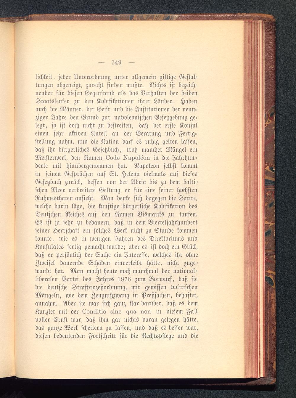 lichkeit, jeder Unterordnung unter allgemein giltige Gestal-tungen abgeneigt, zurecht finden mußte. Nichts ist bezeich-nender für diesen Gegenstand als das Verhalten der beidenStaatslenker zn den Kodifikatioueu ihrer Länder. Habenauch die Mänuer, der Geist und die Institutionen der neun-ziger Jahre den Grnnd znr napoleonischen Gesetzgebung ge-legt, so ist doch nicht zu bestreiten, daß der erste Konsuleinen sehr aktiven Anteil an der Beratung und Fertig-stellung nahm, und die Nation darf es ruhig gelten lassen,daß ihr bürgerliches Gesetzbuch, trotz mancher Mängel einMeisterwerk, den Namen L!oäs U'g.xolson in die Jahrhun-derte mit hiuübergenommen hat. Napoleon selbst kommtin seinen Gesprächen auf St. Heleua vielmals auf diesesGesetzbuch zurück, desfeu von der Adria bis zu dem balti-schen Meer verbreitete Geltung er für eine seiner höchstenRuhmesthaten ansieht. Man denke sich dagegen die Satire,welche darin lüge, die künftige bürgerliche Kodifikation desDeutschen Reiches auf den Namen Bismarcks zu taufen.Es ist ja sehr zu bedauern, daß in dem Vierteljahrhuudertseiner Herrschaft ein solches Werk nicht zu Stande kommenkonnte, wie es in wenigen Jahren des Direktoriums undKonsulates fertig gemacht wurde; aber es ist doch ein Glück,daß er persönlich der Sache ein Interesse, welches ihr ohneZweifel dauernde Schäden einverleibt hätte, nicht zuge-wandt hat. Man macht heute noch manchmal der national-liberalen Partei des Jahres 1876 zum Vorwurf, daß siedie deutsche Strafprozeßordnung, mit gewisfeu politischenMängeln, wie dem Zeugnißzwang in Preßsachen, behaftet,annahm. Aber sie war sich ganz klar darüber, daß es demKanzler mit der Ooiiäitio Zins c^ug, iion in diesem Fallvoller Erust war, daß ihm gar nichts daran gelegen hätte,das ganze Werk scheitern zu lassen, und daß es besser war,diesen bedeutenden Fortschritt für die Rechtspflege und die