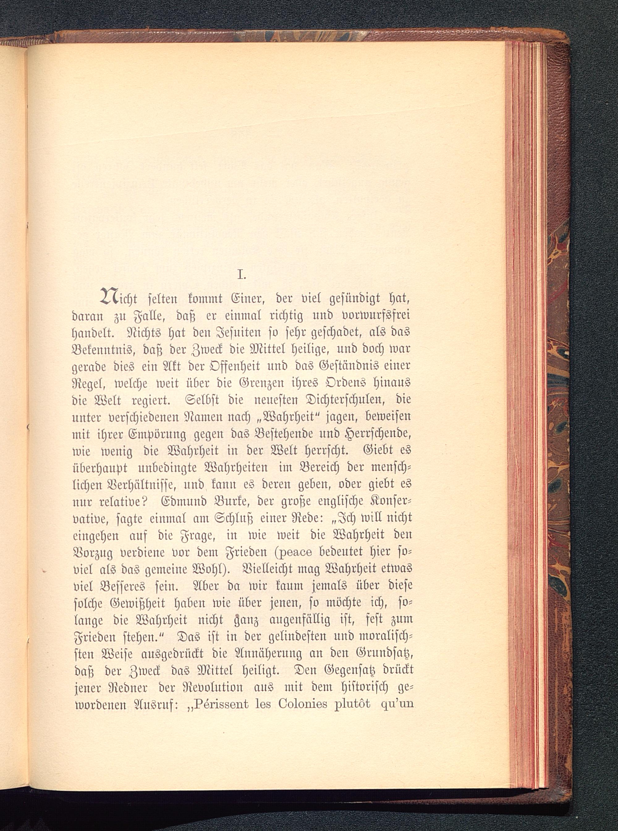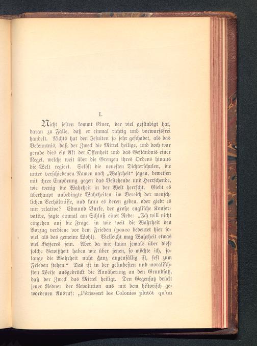 ^icht selten koimnt Einer, der viel gesündigt hat,daran zn Falle, daß er einmal richtig und vorwurfsfreihandelt. Nichts hat den Jesuiten so sehr geschadet, als dasBekenntnis, daß der Zweck die Mittel heilige, und doch wargerade dies ein Akt der Offenheit und das Geständnis einerRegel, welche weit über die Grenzen ihres Ordens hinausdie Welt regiert. Selbst die neuesten Dichterschulen, dieunter verschiedenen Namen nach „Wahrheit" jagen, beweisenmit ihrer Empörung gegen das Bestehende und Herrschende,wie wenig die Wahrheit in der Welt herrscht. Giebt esüberhaupt unbedingte Wahrheiten im Bereich der mensch-lichen Verhältnisse, und kaun es deren geben, oder giebt esnur relative? Edmund Burke, der große englische Konser-vative, sagte einmal am Schluß eiuer Rede: „Ich will nichteingehen auf die Frage, iu wie weit die Wahrheit denVorzug verdieue vor dem Frieden (xsaos bedeutet hier so-viel als das gemeine Wohl). Vielleicht mag Wahrheit etwasviel Besseres sein. Aber da wir kaum jemals über diesesolche Gewißheit habeu wie über jenen, so möchte ich, so-lange die Wahrheit nicht ganz augenfällig ist, fest zumFrieden stehen." Das ist in der gelindesten und moralisch-sten Weise ausgedrückt die Annäherung an den Grundsatz,daß der Zweck das Mittel heiligt. Den Gegensatz drücktjener Redner der Revolution aus mit dem historisch ge-wordenen Ausruf: „^srisssut Iss Loloräks i)1ut.öt, <zu'un