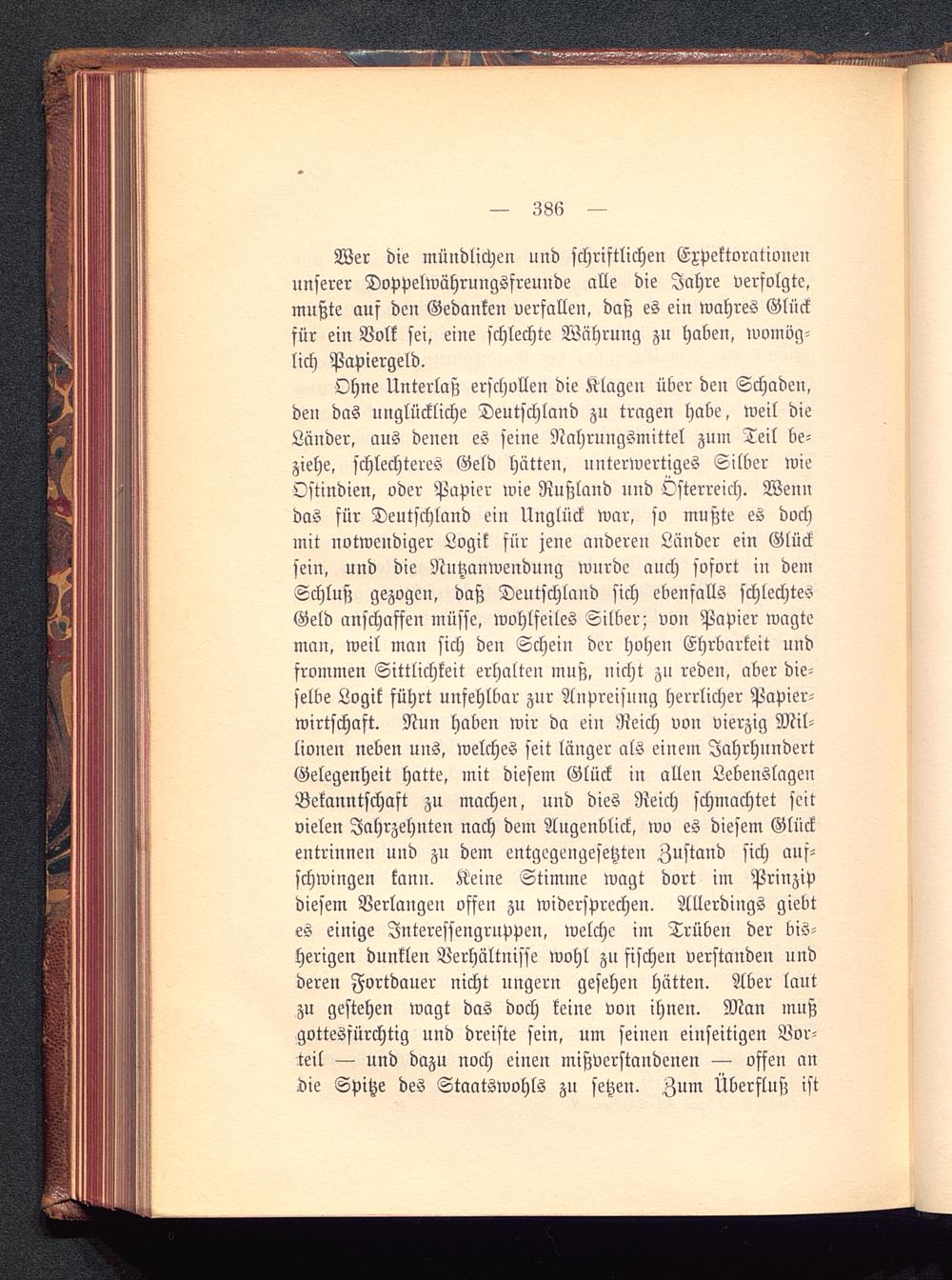 Ohne Unterlaß erschollen die Klagen über den Schaden,den das unglückliche Deutschland zu tragen habe, weil dieLänder, aus denen es seine Nahrungsmittel zuin Teil be-ziehe, schlechteres Geld Hütten, unterwertiges Silber wieOstindien, oder Papier wie Rußland nnd Österreich. Wenndas für Deutschland ein Unglück war, so mußte es dochmit notwendiger Logik für jene anderen Länder ein Glücksein, und die Nutzanwendung wurde auch sofort in demSchluß gezogen, daß Deutschland sich ebenfalls schlechtesGeld anschaffen müsse, wohlfeiles Silber; von Papier wagteman, weil man sich den Schein der hohen Ehrbarkeit undfrommen Sittlichkeit erhalten muß, nicht zu reden, aber die-selbe Logik führt unfehlbar zur Anpreisung herrlicher Papier-wirtschaft. Nun haben wir da ein Reich von vierzig Mil-lionen neben uns, welches seit länger als einem JahrhundertGelegenheit hatte, mit diesem Glück in allen LebenslagenBekanntschaft zu machen, und dies Reich schmachtet seitvielen Jahrzehnten nach dem Angenblick, wo es diesem Glückentrinnen und zn dem entgegengesetzten Zustand sich auf-schwingen kann. Keine Stimme wagt dort im Prinzipdiesem Verlangen offen zu widersprechen. Allerdings giebtes einige Interessengruppe», welche im Trüben der bis-herigen dunklen Verhältnisse wohl zu fischen verstanden undderen Fortdauer nicht ungern gesehen hätten. Aber lautzu gestehen wagt das doch keine von ihnen. Man mußgottesfürchtig und dreiste sein, um seinen einseitigen Vor-teil — und dazu noch einen mißverstandenen — offen antue Spitze des Staatswohls zu setzen. Zum Überfluß ist