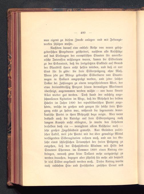 Nachdem darauf eine endlose Reihe von neuen gesetz-geberischen Prozeduren gescheitert, nachdem alle Anschlägeauf das Einfangen der europäischen Staaten für amerika-nische Interessen mißlungen waren, kamen die Silberleutezu der Erkenntnis, daß die fortgesetzten Einkäufe auf Grundder Blandbill ihnen nicht helfen würden, und daß es nurEins für sie gäbe: die freie Silberprägung ohne Maß.Wenn jede zur Münze gebrachte Silberbarre von Staats-wegen in Dollars umgeprägt werden, und jeder solcherDollar bei Zahlungen zu einem vorgeschriebenen Wert, deretwa dreiunddreißig Prozent seinen dermaligen Marktwertübersteigt, angenommen werden müßte — nur dann könnteAlles wieder gut werden. Doch stand der mächtig ange-schwollenen Agitation im Wege, daß die Mehrheit der beidenHäuser im Jahre 1890 der republikanischen Partei ange-hörte, welche im großen und ganzen für solche freie Prä-gung nicht zu haben war, während die sogenannte demo-kratische Partei in ihrer Mehrzahl dazu neigte. Aber wenndeshalb auch die Anträge auf freie Silberprügung uachlangem Kampfe nicht obsiegten, so wurde den Urhebernderselben doch ein — wenigstens allem Anscheine nach —sehr großes Zugeständnis gemacht. Aus Gründen Politi-scher Taktik, weil jede Partei mit der über gewaltige Mittelverfügenden Silberagitation rechnen muß, und um der Ge-fahr eines schließlichen Triumphes der freien Prägung zuentgehen, ließ der Schatzsekretär Windom mit Hilfe desSenators Sherman im Sommer 1890 einen Antrag ein-bringen, wonach zwar keine Dollars mehr ausgeprägt zuwerde» brauchen, dagegen aber jährlich für mehr als doppeltso viel Silber angekauft werden mnß. Dieser Antrag wurdenach endlosem Hin- und Herschieben zwischen Senat uud
