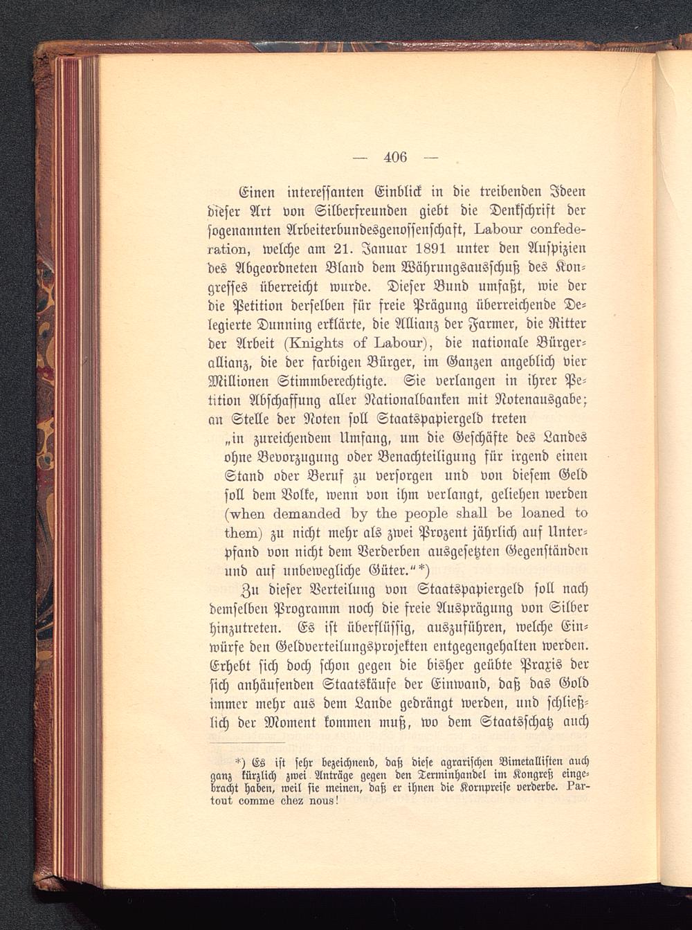 Einen interessanten Einblick in die treibenden Ideendieser Art von Silberfreunden giebt die Denkschrift dersogenannten Arbeiterbundesgenossenschaft, I^dour eoniscks-ration, welche am 21. Januar 1891 unter den Auspiziendes Abgeordneten Bland dem Währungsausschuß des Kon-gresses überreicht wurde. Dieser Bund umfaßt, wie derdie Petition derselben für freie Prägung überreichende De-legierte Dunning erklärte, die Allianz der Farmer, die Ritterder Arbeit (ILniAQts o5 I^bour), die nationale Bürger-allianz, die der farbigen Bürger, im Ganzen angeblich vierMillionen Stimmberechtigte. Sie verlangen in ihrer Pe-tition Abschaffung aller Nationalbanken mit Notenausgabe;an Stelle der Noten soll Staatspapiergeld treten