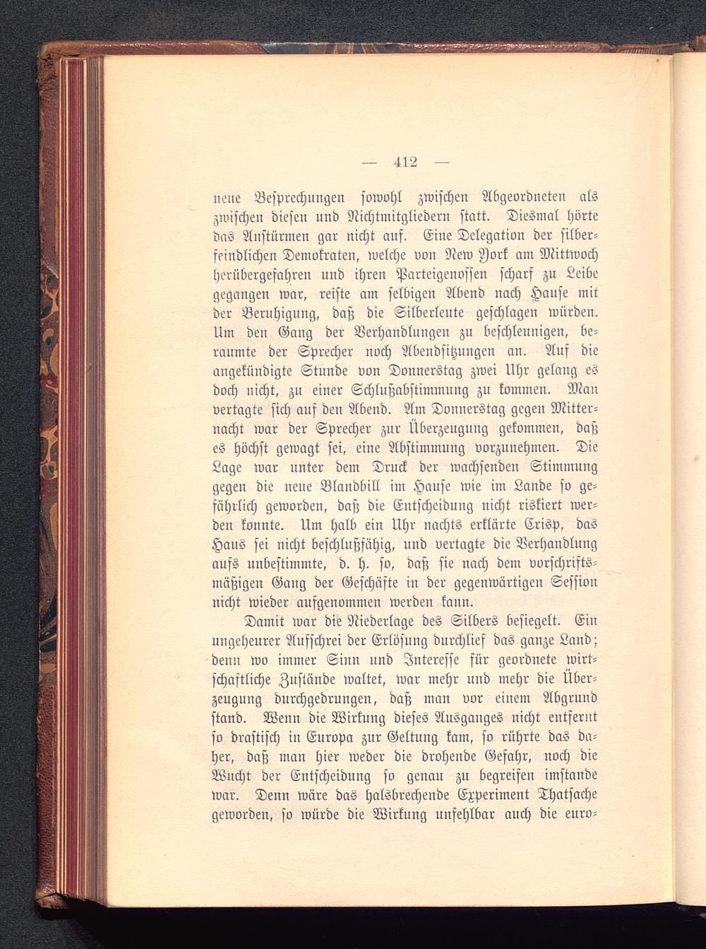 neue Besprechungen sowohl zwischen Abgeordneten alszwischen diesen und NichtMitgliedern statt. Diesmal hörtedas Anstürmen gar nicht auf. Eine Delegation der silber-feindlichen Demokraten, welche von New Jork am Mittwochherübergefahreu und ihren Parteigenosfen scharf zu Leibegegangen war, reiste am selbigen Abend nach Hause mitder Beruhigung, daß die Silberleute geschlagen würden.Um deu Gang der Verhandlungen zu beschleunigen, be-raumte der Sprecher noch Abendsitzungen an. Auf dieangekündigte Stunde von Donnerstag zwei Uhr gelang eSdoch nicht, zu einer Schlußabstimmung zu kommen. Manvertagte sich auf den Abend. Am Donnerstag gegen Mitter-nacht war der Sprecher zur Überzeugung gekommen, daßes höchst gewagt sei, eine Abstimmung vorzunehmen. DieLage war unter dem Druck der wachsenden Stimmunggegen die neue Blandbill im Hause wie im Lande so ge-fährlich geworden, daß die Entscheidung nicht riskiert wer-den konnte. Um halb ein Uhr nachts erklärte Crisp, dasHaus sei nicht beschlußsähig, und vertagte die Verhandlungaufs unbestimmte, d. h. so, daß sie nach dem vorschrifts-mäßigen Gang der Geschäfte in der gegenwärtigen Sessionnicht wieder aufgenommen werden kann.