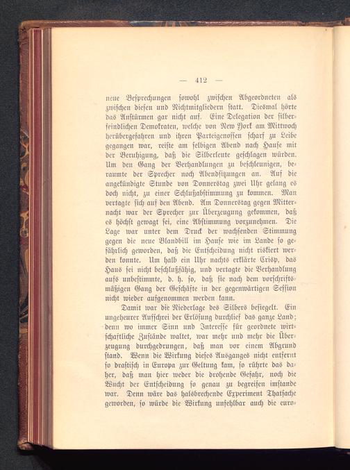 Damit war die Niederlage des Silbers besiegelt. Einungeheurer Aufschrei der Erlösung durchlief das ganze Land;denn wo immer Sinn und Interesse für geordnete wirt-schaftliche Zustände waltet, war mehr und mehr die Über-zeugung durchgedrungen, daß man vor einem Abgrundstand. Wenn die Wirkung dieses Ausgauges nicht entferntso drastisch in Europa zur Geltung kam, so rührte das da-her, daß man hier weder die drohende Gefahr, noch dieWucht der Entscheidung so genau zu begreifen imstandewar. Denn wäre das halsbrechende Experiment Thatsache geworden, so würde die Wirkung unfehlbar auch die euro -