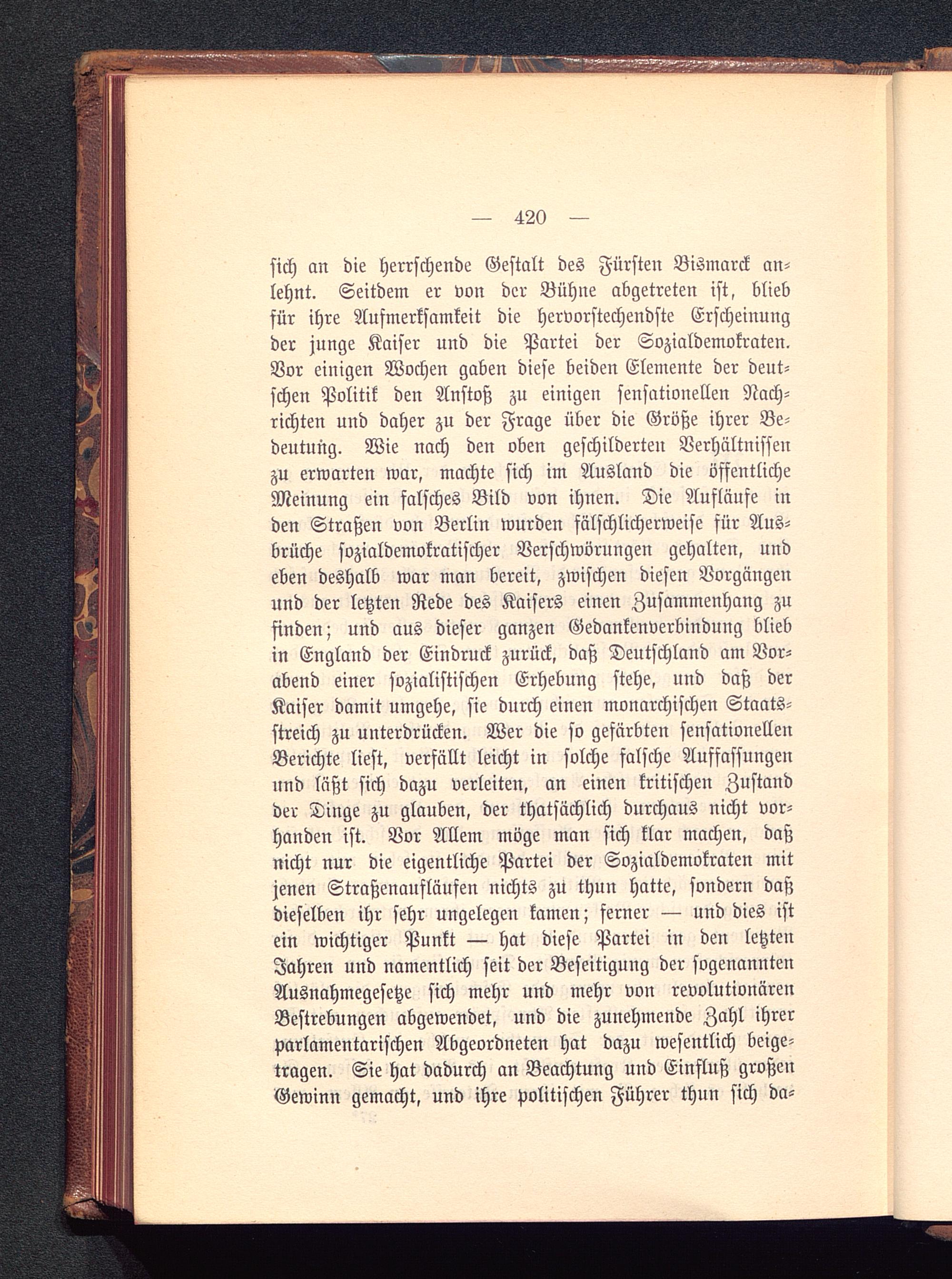sich an die herrschende Gestalt des Fürsten Bismarck an-lehnt. Seitdem er von der Bühne abgetreten ist, bliebfür ihre Aufmerksamkeit die hervorstechendste Erscheinungder junge Kaiser und die Partei der Sozialdemokraten.Vor einigen Wochen gaben diese beiden Elemente der deut-schen Politik den Anstoß zu einigen sensationellen Nach-richten und daher zu der Frage über die Größe ihrer Be-deutung. Wie nach den oben geschilderten Verhältnissenzu erwarten war, machte sich im Ausland die öffentlicheMeinung ein falsches Bild von ihnen. Die Aufläufe inden Straßen von Berlin wurden fälschlicherweise für Aus-brüche sozialdemokratischer Verschwörungen gehalten, undeben deshalb war man bereit, zwischen diesen Vorgängenund der letzten Rede des Kaisers einen Zusammenhang zufinden; und aus dieser ganzen Gedankenverbindung bliebin England der Eindruck zurück, daß Deutschland am Vor-abend einer sozialistischen Erhebung stehe, und daß derKaiser damit umgehe, sie durch einen monarchischen Staats-streich zu unterdrücken. Wer die so gefärbten sensationellenBerichte liest, verfällt leicht in solche falsche Auffassungeuund läßt sich dazu verleiten, an einen kritischen Zustaudder Dinge zu glauben, der thatsächlich durchaus nicht vor-handen ist. Vor Allem möge man sich klar machen, daßnicht nur die eigentliche Partei der Sozialdemokraten mitjenen Straßenaufläufen nichts zu thun hatte, sondern daßdieselben ihr sehr ungelegen kamen; ferner — und dies istein wichtiger Punkt — hat diese Partei in den letztenJahren und namentlich seit der Beseitigung der sogenanntenAusnahmegesetze sich mehr und mehr von revolutionärenBestrebungen abgewendet, und die zunehmende Zahl ihrerparlamentarischen Abgeordneten hat dazu wesentlich beige-tragen. Sie hat dadurch an Beachtung und Einfluß großenGewinn gemacht, und ihre politischen Führer thun sich da-