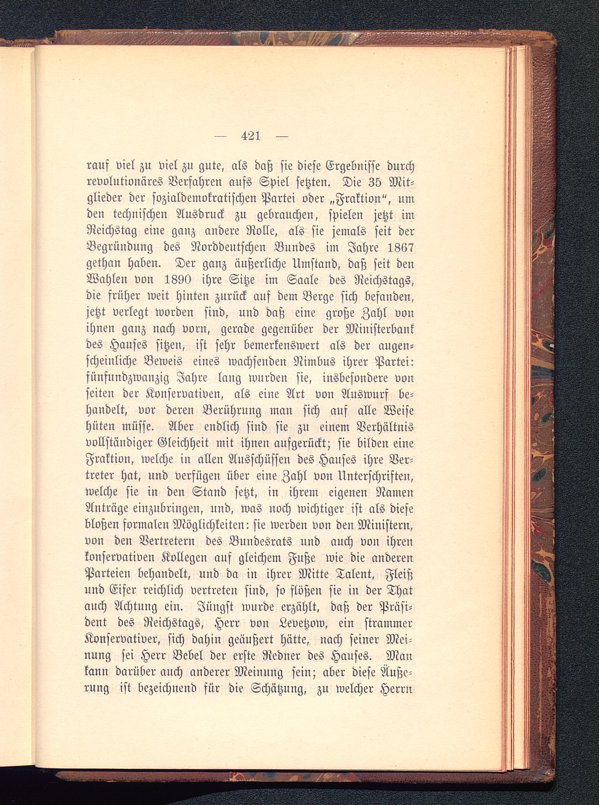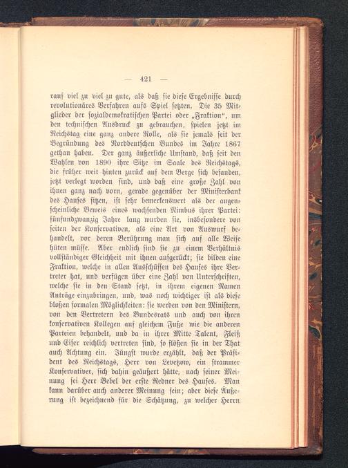rauf viel zu viel zu gute, als daß sie diese Ergebnisse durchrevolutionäres Verfahren aufs Spiel setzten. Die 35 Mit-glieder der sozialdemokratischen Partei oder „Fraktion", umden technischen Ausdruck zu gebrauchen, spielen jetzt imReichstag eine ganz andere Rolle, als sie jemals seit derBegründung des Norddeutschen Bundes im Jahre 1867gethan haben. Der ganz äußerliche Umstand, daß seit denWahlen von 1890 ihre Sitze im Saale des Reichstags,die früher weit hinten zurück auf dem Berge sich befanden,jetzt verlegt worden sind, und daß eine große Zahl vonihnen ganz nach vorn, gerade gegenüber der Ministerbankdes Hauses sitzen, ist sehr bemerkenswert als der augen-scheinliche Beweis eines wachsenden Nimbus ihrer Partei:fünfundzwanzig Jahre lang wurden sie, insbesondere vonfeiten der Konservativen, als eine Art von Auswurf be-handelt, vor deren Berührung man sich auf alle Weisehüten müsse. Aber endlich sind sie zu einem Verhältnisvollständiger Gleichheit mit ihnen aufgerückt; sie bilden eineFraktion, welche in allen Ausschüsfen des Hauses ihre Ver-treter hat, und verfügen über eine Zahl von Unterschriften,welche sie in den Stand setzt, in ihrem eigenen NamenAnträge einzubringen, und, was noch wichtiger ist als diesebloßen formalen Möglichkeiten: sie werden von den Ministern,von den Vertretern des Bundesrats und auch von ihrenkonservativen Kollegen auf gleichem Fuße wie die anderenParteien behandelt, und da in ihrer Mitte Talent, Fleißund Eifer reichlich vertreten sind, so flößen sie in der Thatauch Achtung ein. Jüngst wurde erzählt, daß der Präsi-dent des Reichstags, Herr von Levetzow, ein strammerKonservativer, sich dahin geäußert hätte, nach seiner Mei-nung sei Herr Bebel der erste Redner des Hauses. Mankann darüber auch anderer Meinung sein; aber diese Äuße-rung ist bezeichnend für die Schätzung, zu welcher Herrn