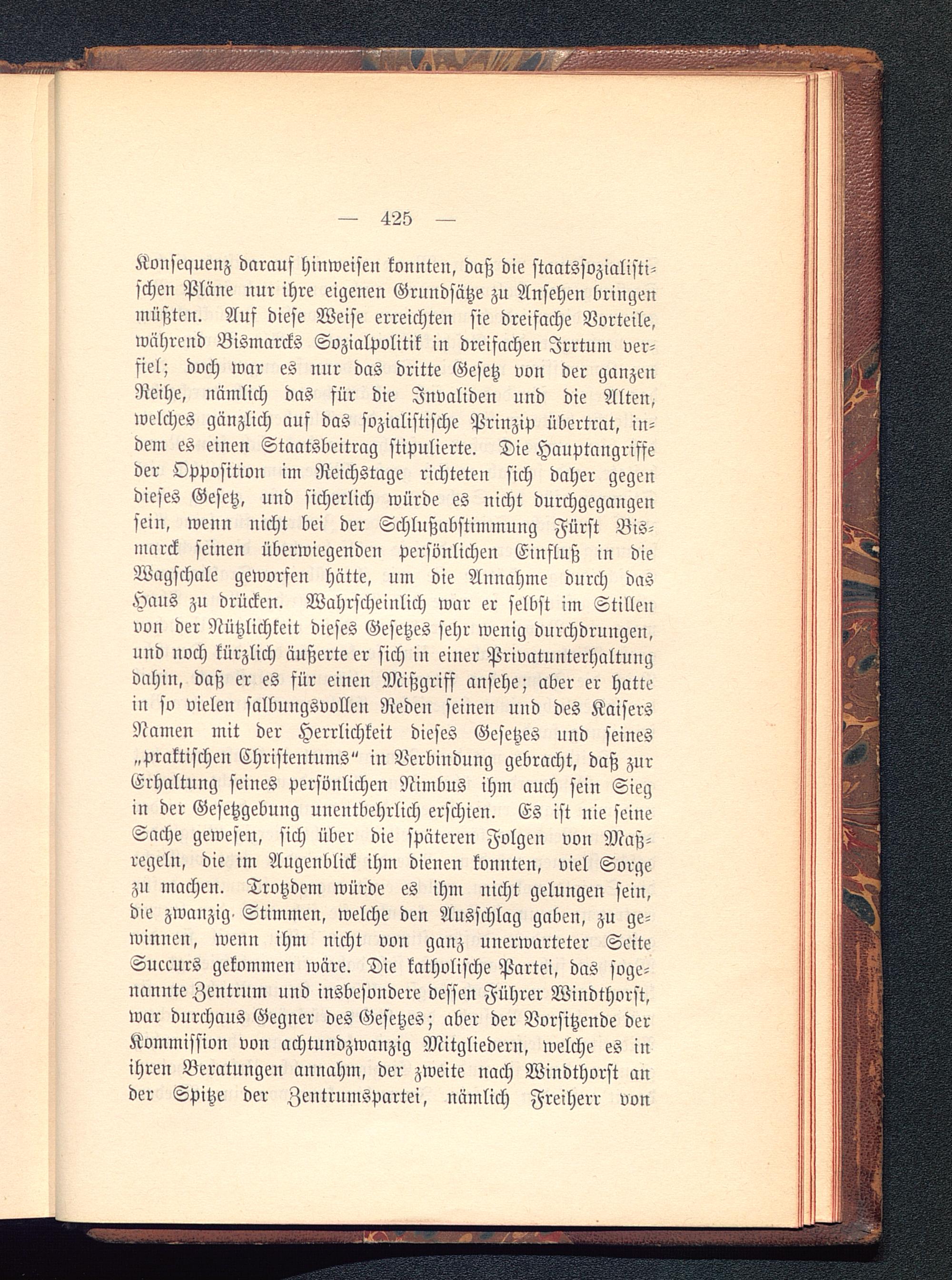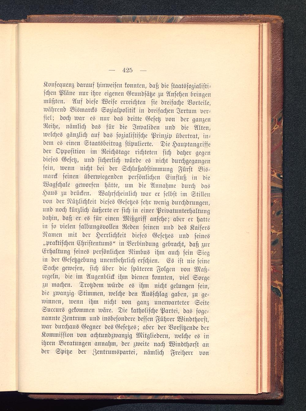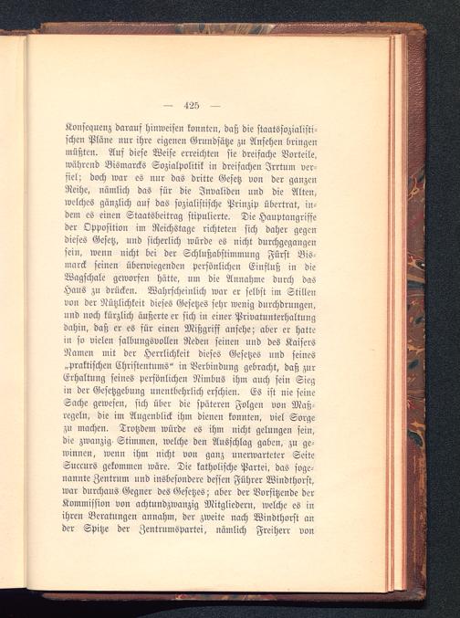 Konsequenz darauf hinweisen konnten, daß die staatssozialisti-schen Pläne nur ihre eigenen Grundsätze zu Ansehen bringenmüßten. Auf diese Weise erreichten sie dreifache Vorteile,während Bismarcks Sozialpolitik in dreifachen Irrtum ver-fiel; doch war es nur das dritte Gesetz von der ganzenReihe, nämlich das für die Invaliden und die Alten,welches gänzlich auf das sozialistische Prinzip übertrat, in-dem es einen Staatsbeitrag stipulierte. Die Hauptangriffeder Opposition im Reichstage richteten sich daher gegendieses Gesetz, und sicherlich würde es nicht durchgegangensein, wenn nicht bei der Schlußabstimmung Fürst Bis-marck seinen überwiegenden persönlichen Einfluß in dieWagschale geworfen hätte, um die Annahme durch dasHaus zu drücken. Wahrscheinlich war er selbst im Stillenvon der Nützlichkeit dieses Gesetzes sehr wenig durchdrungen,und noch kürzlich äußerte er sich iu einer Privatunterhaltungdahin, daß er es für einen Mißgriff ansehe; aber er hattein so vielen salbungsvollen Reden seinen und des KaisersNamen mit der Herrlichkeit dieses Gesetzes und seines„praktischen Christentums" in Verbindung gebracht, daß zurErhaltung seines persönlichen Nimbus ihm auch sein Siegin der Gesetzgebung unentbehrlich erschien. Es ist nie seineSache gewesen, sich über die späteren Folgen von Maß-regeln, die im Augenblick ihm dienen konnten, viel Sorgezu machen. Trotzdem würde es ihm nicht gelungen sein,die zwanzig. Stimmen, welche den Ausschlag gaben, zu ge-winnen, wenn ihm nicht von ganz unerwarteter SeiteSucmrs gekommen wäre. Die katholische Partei, das soge-nannte Zentrum und insbesondere dessen Führer Windthorst,war durchaus Gegner des Gesetzes; aber der Vorsitzende derKommission von achtundzwanzig Mitgliedern, welche es inihren Beratungen annahm, der zweite nach Windthorst ander Spitze der Zentrnmspartei, nämlich Freiherr von