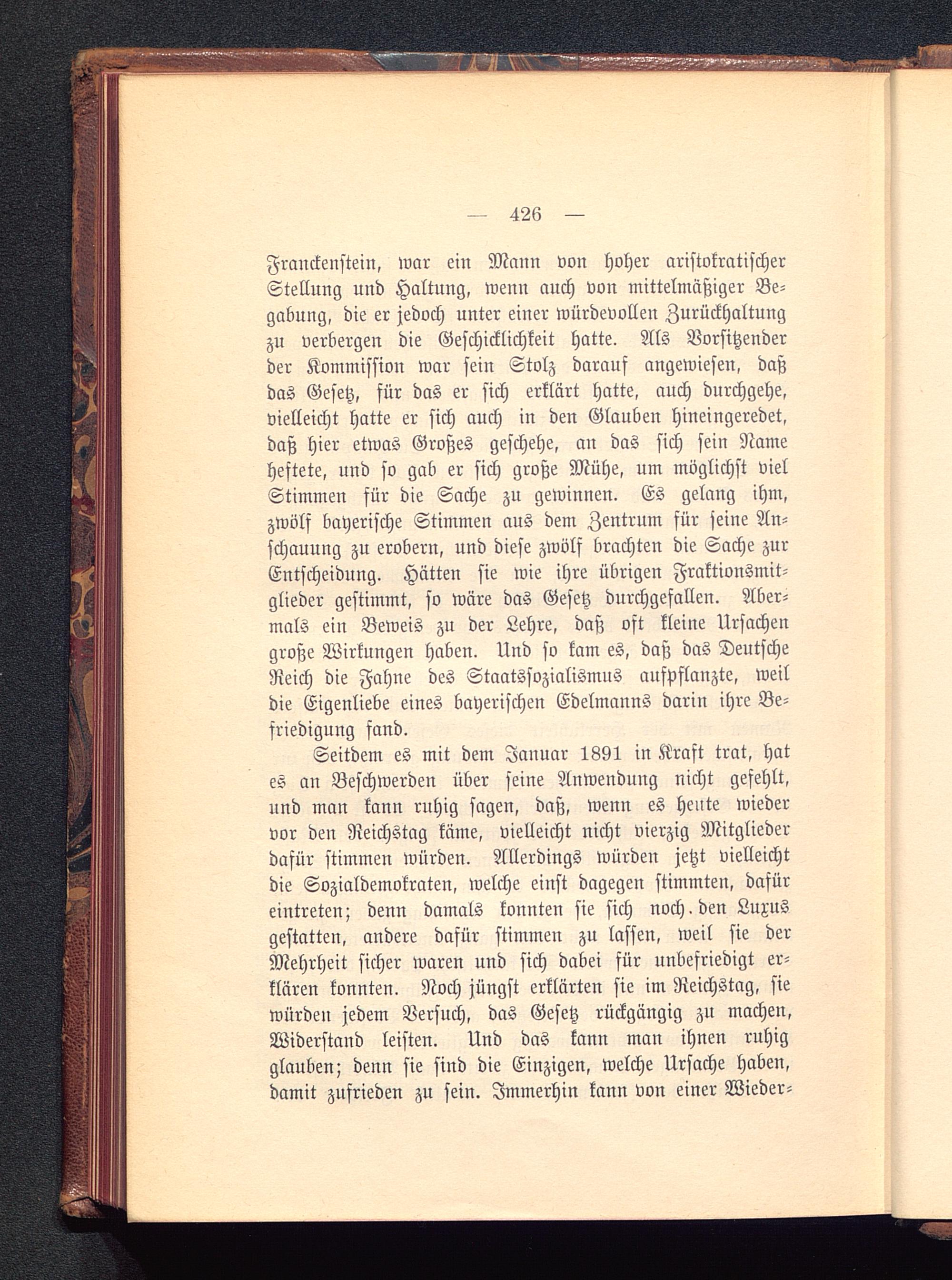 Franckenftein, war ein Mann von hoher aristokratischerStellung und Haltung, wenn auch von mittelmäßiger Be-gabung, die er jedoch unter einer würdevollen Zurückhaltungzu verbergen die Geschicklichkeit hatte. Als Vorsitzenderder Kommission war sein Stolz darauf angewiesen, daßdas Gesetz, für das er sich erklärt hatte, auch durchgehe,vielleicht hatte er sich auch in den Glauben hineingeredet,daß hier etwas Großes geschehe, an das sich sein Nameheftete, und so gab er sich große Mühe, um möglichst vielStimmen für die Sache zu gewinnen. Es gelang ihm,zwölf bayerische Stimmen aus dem Zentrum für seine An-schauung zu erobern, und diese zwölf brachten die Sache zurEntscheidung. Hätten sie wie ihre übrigen Fraktionsmit-glieder gestimmt, so wäre das Gesetz durchgefallen. Aber-mals ein Beweis zu der Lehre, daß oft kleine Ursachengroße Wirkungen haben. Und so kam es, daß das DeutscheReich die Fahne des Staatssozialismns aufpflanzte, weildie Eigenliebe eines bayerischen Edelmanns darin ihre Be-friedigung fand.