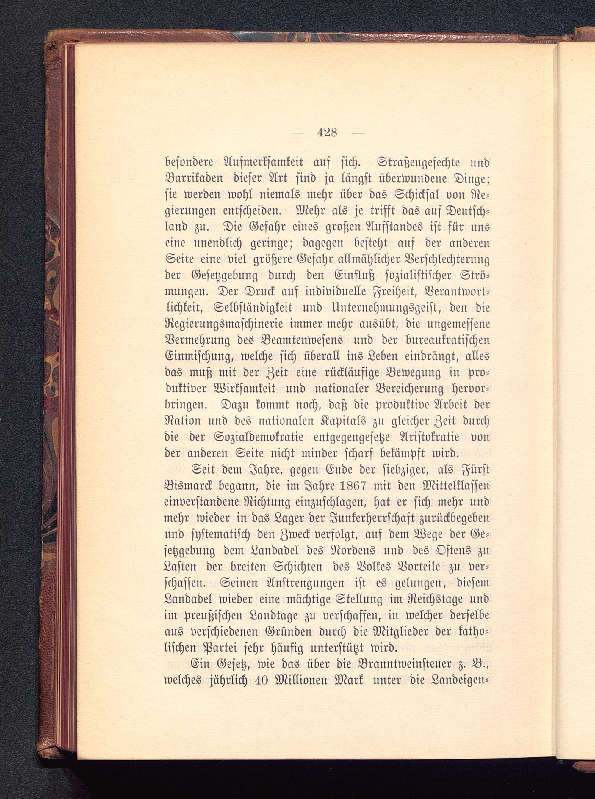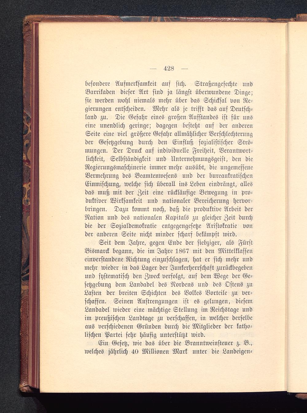 besondere Aufmerksamkeit auf sich. Straßengefechte undBarrikaden dieser Art sind ja längst überwundene Dinge;sie werden wohl niemals mehr über das Schicksal von Re-gierungen entscheiden. Mehr als je trifft das auf Deutsch-land zu. Die Gefahr eines großen Aufstandes ist für unseine unendlich geringe; dagegen besteht auf der anderenSeite eine viel größere Gefahr allmählicher Verschlechterungder Gesetzgebung durch den Einfluß sozialistischer Strö-mungen. Der Druck auf individuelle Freiheit, Verantwort-lichkeit, Selbständigkeit und Unternehmungsgeist, den dieRegierungsmaschinerie immer mehr ausübt, die ungemesfeneVermehrung des Beamtenwesens und der bureaukratischeuEinmischung, welche sich überall ins Leben eindrängt, allesdas muß mit der Zeit eine rückläufige Bewegung in Pro-duktiver Wirksamkeit und nationaler Bereicherung hervor-bringen. Dazu kommt noch, daß die produktive Arbeit derNation und des nationalen Kapitals zn gleicher Zeit durchdie der Sozialdemokratie entgegengesetze Aristokratie vonder anderen Seite nicht minder scharf bekämpft wird.
