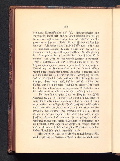 Seit dem Jahre, gegen Ende der siebziger, als FürstBismarck begann, die im Jahre 1867 mit den Mittelklasseneinverstandene Richtung einzuschlagen, hat er sich mehr undmehr wieder in das Lager der Junkerherrschaft zurückbegebenund systematisch den Zweck verfolgt, auf dem Wege der Ge-setzgebung dem Landadel des Nordens und des Ostens zuLasten der breiten Schichten des Volkes Vorteile zu ver-schaffen. Seinen Anstrengungen ist es gelungen, diesemLandadel wieder eine mächtige Stellung im Reichstage undim preußischen Landtage zu verschaffen, in welcher derselbeaus verschiedenen Gründen durch die Mitglieder der katho-lischen Partei sehr häufig unterstützt wird.