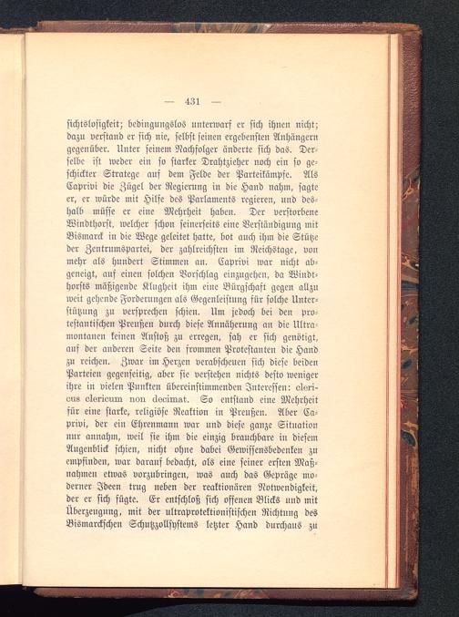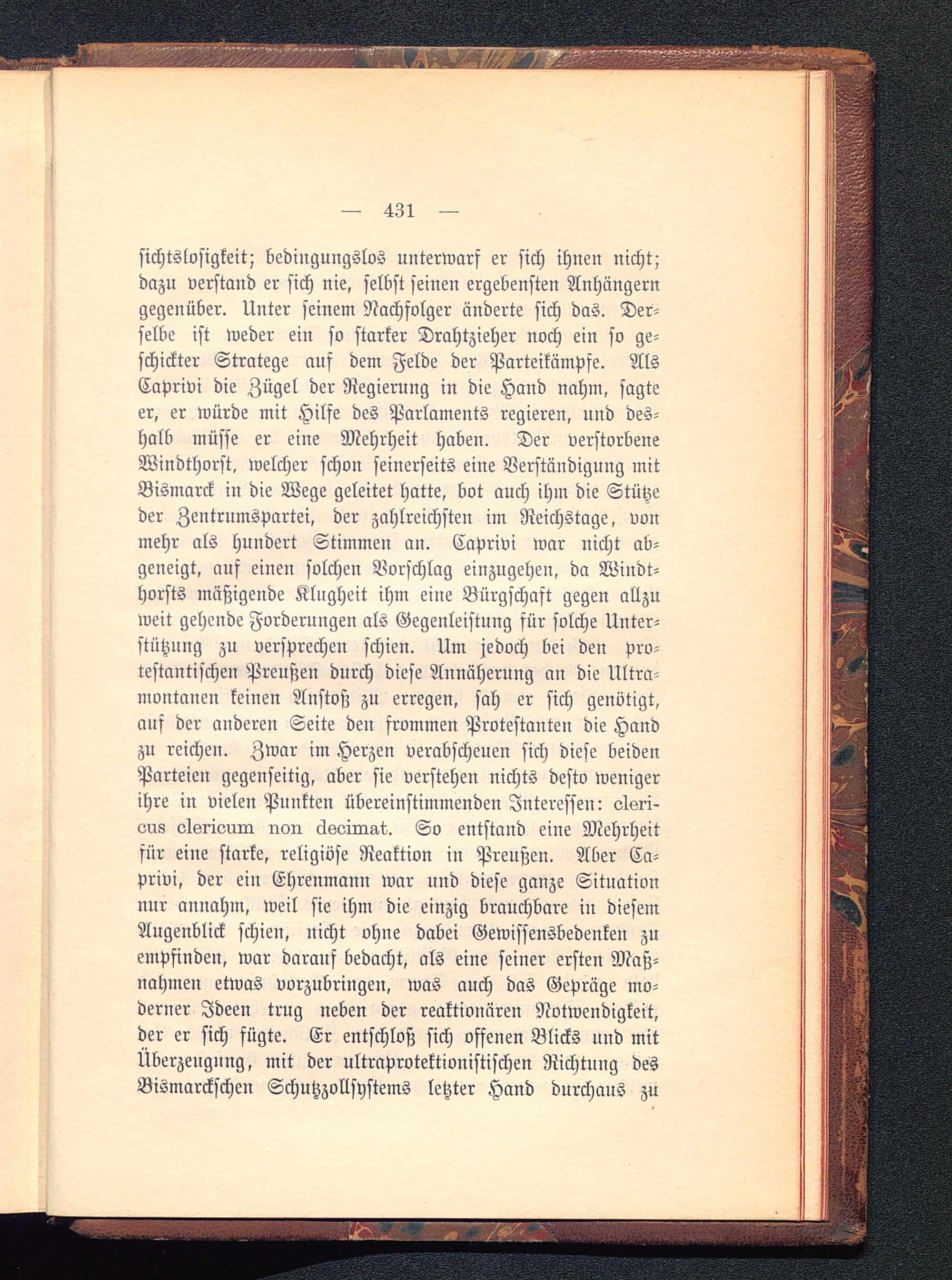 sichtslosigkeit; bedingungslos unterwarf er sich ihnen nicht;dazu verstand er sich nie, selbst seinen ergebensten Anhängerngegenüber. Unter seinem Nachfolger änderte sich das. Der-selbe ist weder ein so starker Drahtzieher noch ein so ge-schickter Stratege auf dem Felde der Parteikämpfe. AlsCaprivi die Zügel der Regierung in die Hand nahm, sagteer, er würde mit Hilfe des Parlaments regieren, und des-halb müsse er eine Mehrheit haben. Der verstorbeneWindthorst. welcher schon seinerseits eine Verständigung mitBismarck in die Wege geleitet hatte, bot auch ihm die Stützeder Zentrumspartei , der zahlreichsten im Reichstage, vonmehr als hundert Stimmeu an. Caprivi war nicht ab-geneigt, auf einen solchen Vorschlag einzugehen, da Windt-horsts mäßigende Klugheit ihm eine Bürgschaft gegen allzuweit gehende Forderungen als Gegenleistung für solche Unter-stützung zn versprechen schien. Um jedoch bei den pro-testantischen Preußen durch diese Annäherung an die Ultra-montanen keinen Anstoß zu erregen, sah er sich genötigt,auf der anderen Seite den frommen Protestanten die Handzu reichen. Zwar im Herzen verabscheuen sich diese beidenParteien gegenseitig, aber sie verstehen nichts desto wenigerihre in vielen Punkten übereinstimmenden Interessen: elsri-ous olsi-ivum non äkoirQat. So entstand eine Mehrheitsür eine starke, religiöse Reaktion in Preußen . Aber Ca-privi, der ein Ehrenmann war und diese ganze Situationnur annahm, weil sie ihm die einzig brauchbare iu diesemAugenblick schien, nicht ohne dabei Gewissensbedenken zuempfinden, war darauf bedacht, als eine seiner ersten Maß-nahmen etwas vorzubringen, was auch das Gepräge mo-derner Ideen trug neben der reaktionären Notwendigkeit,der er sich fügte. Er entschloß sich offenen Blicks und mitÜberzeugung, mit der ultraprotektionistischen Richtung desBismarckschen Schutzzollsystems letzter Hand durchaus zu