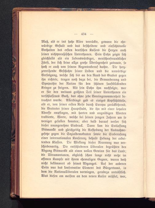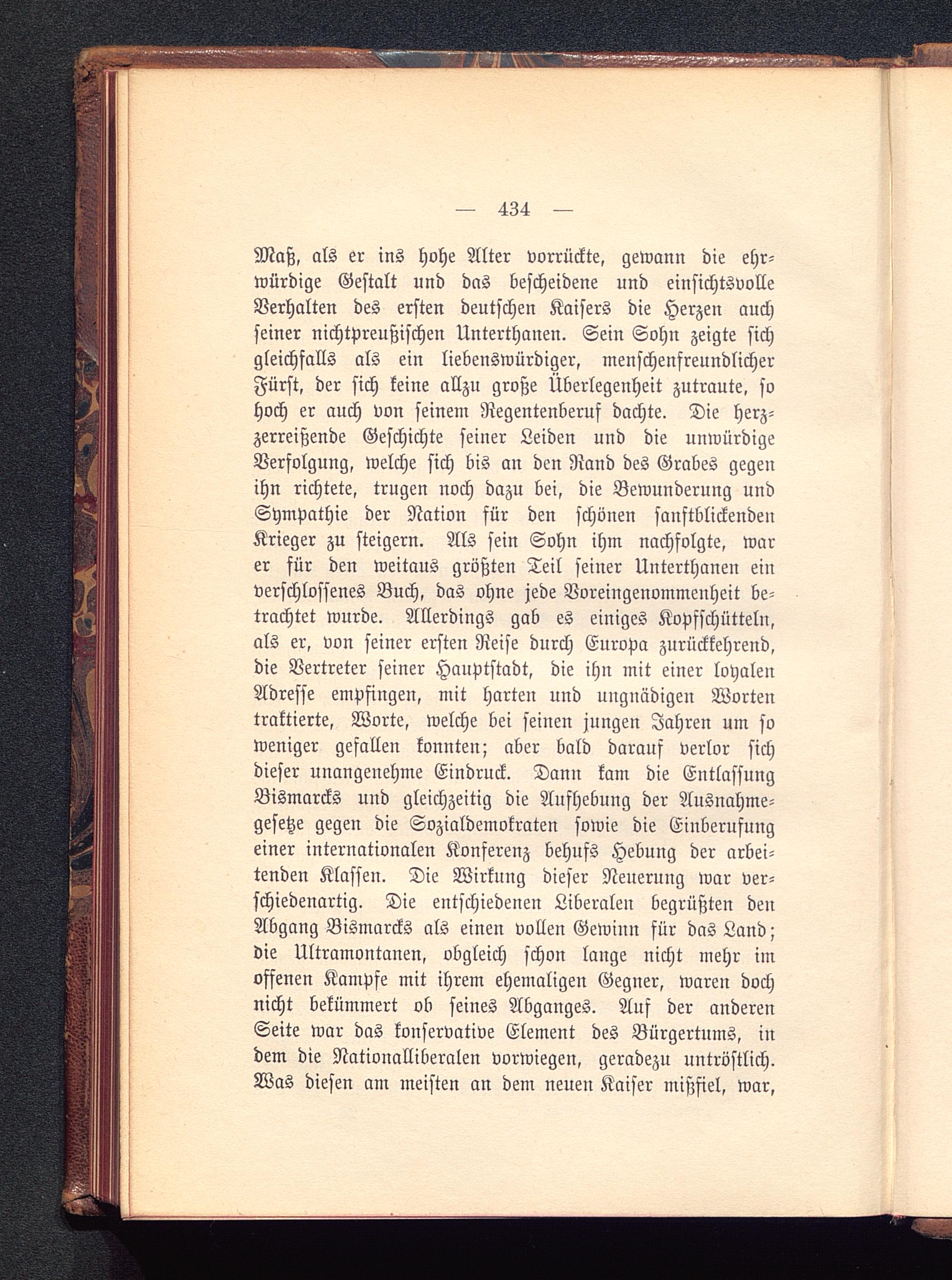 Maß, als er ins hohe Alter vorrückte, gewann die ehr-würdige Gestalt und das bescheidene und einsichtsvolleVerhalten des ersten deutschen Kaisers die Herzen auchseiner nichtpreußischen Unterthanen. Sein Sohn zeigte sichgleichfalls als ein liebenswürdiger, menschenfreundlicherFürst, der sich keine allzu große Überlegenheit zutraute, sohoch er auch von seinem Regentenberuf dachte. Die herz-zerreißende Geschichte seiner Leiden und die unwürdigeVerfolgung, welche sich bis an den Rand des Grabes gegenihn richtete, trugen noch dazu bei, die Bewunderung undSympathie der Nation für den schönen sanftblickendenKrieger zu steigern. Als sein Sohn ihm nachfolgte, warer für den weitaus größten Teil seiner Unterthanen einverschlossenes Buch, das ohne jede Voreingenommenheit be-trachtet wurde. Allerdings gab es einiges Kopsschütteln,als er, von seiner ersten Reise durch Europa zurückkehrend,die Vertreter seiner Hauptstadt, die ihn mit einer loyalenAdresse empfingen, mit harten und ungnädigen Wortentraktierte, Worte, welche bei seineu jungen Jahren um soweniger gefallen konnten; aber bald darauf verlor sichdieser unangenehme Eindruck. Dann kam die EntlassungBismarcks und gleichzeitig die Aufhebung der Ausnahme-gesetze gegen die Sozialdemokraten sowie die Einberufungeiner internationalen Konferenz behufs Hebung der arbei-tenden Klassen. Die Wirkung dieser Neuerung war ver-schiedenartig. Die entschiedenen Liberalen begrüßten denAbgang Bismarcks als einen vollen Gewinn für das Land;die Ultramontanen, obgleich schon lange nicht mehr imoffenen Kampfe mit ihrem ehemaligen Gegner, waren dochnicht bekümmert ob seines Abganges. Auf der anderenSeite war das konservative Element des Bürgertums, indem die Nationalliberalen vorwiegen, geradezu untröstlich.Was diesen am meisten an dem neueu Kaiser mißfiel, war,