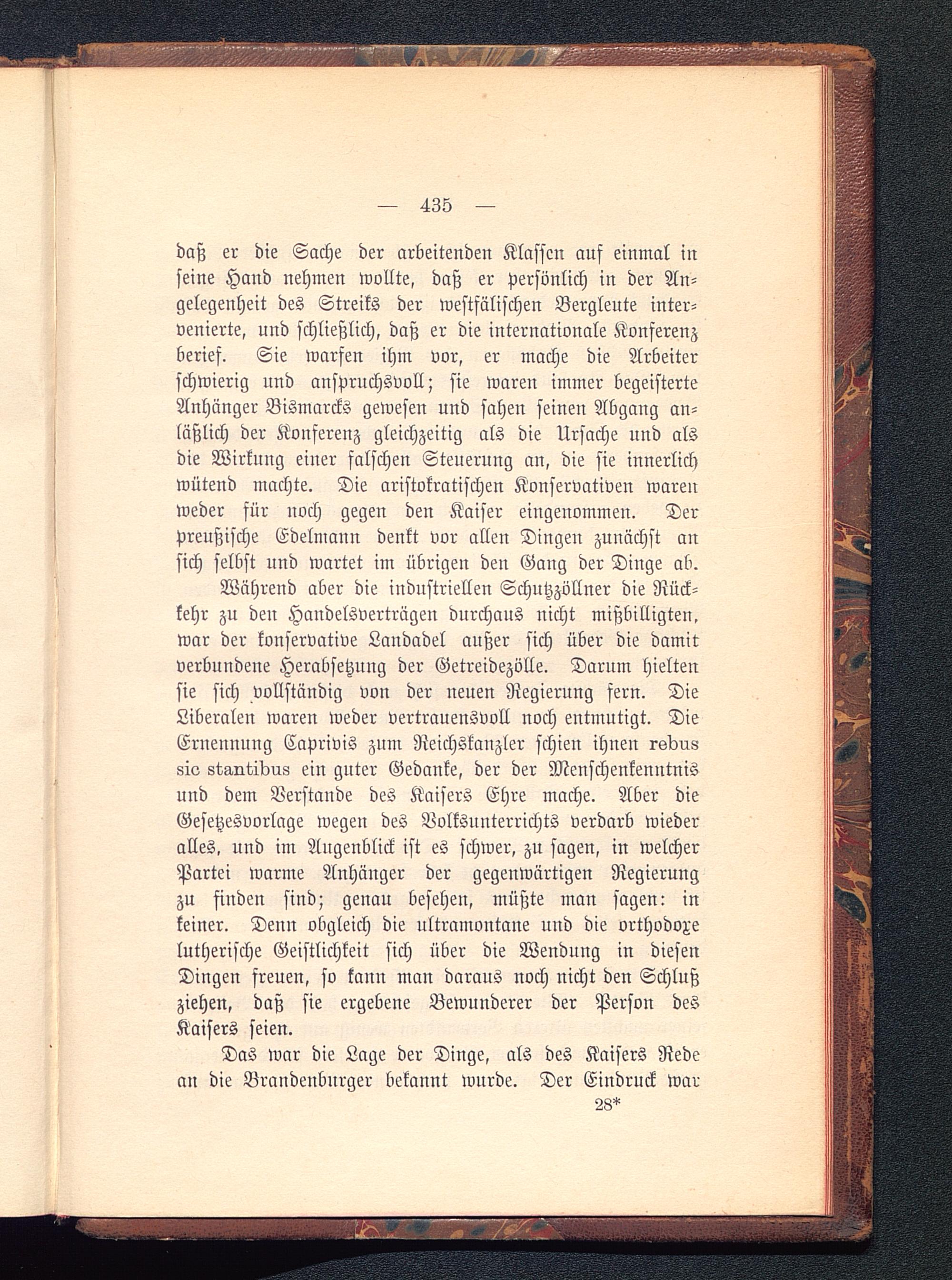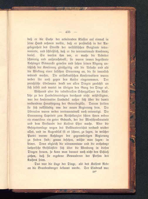 daß er die Sache der arbeitenden Klassen auf einmal inseine Hand nehmen wollte, daß er persönlich in der An-gelegenheit des Streiks der westfälischen Bergleute inter-venierte, und schließlich, daß er die internationale Konferenzberief. Sie warfen ihm vor, er mache die Arbeiterschwierig und anspruchsvoll; sie waren immer begeisterteAnhänger Bismarcks gewesen und sahen seinen Abgang an-läßlich der Konferenz gleichzeitig als die Ursache und alsdie Wirkung einer falschen Steuerung an, die sie innerlichwütend machte. Die aristokratischen Konservativen warenweder für noch gegen den Kaiser eingenommen. Derpreußische Edelmann denkt vor allen Dingen zunächst ansich selbst und wartet im übrigen den Gang der Dinge ab.